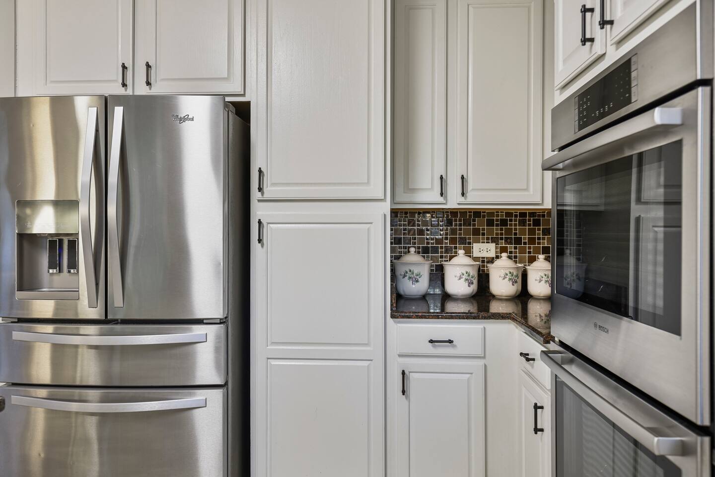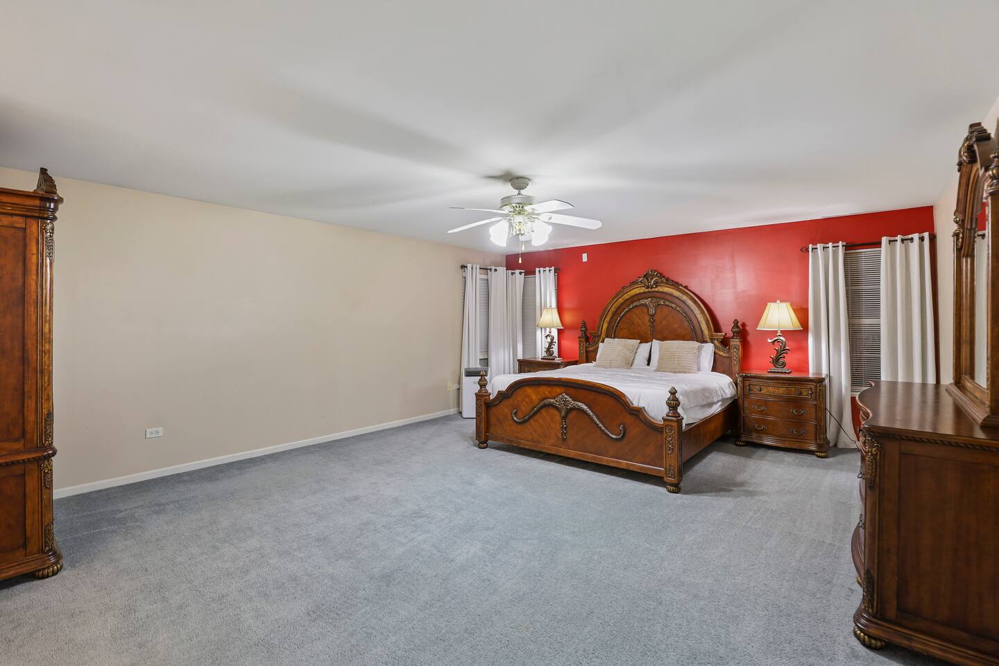 • The master suite is a true retreat with a king-size bed, his and hers closets, and an expansive en suite bathroom with dual sinks, a separate shower, a Jacuzzi tub, and a private toilet room