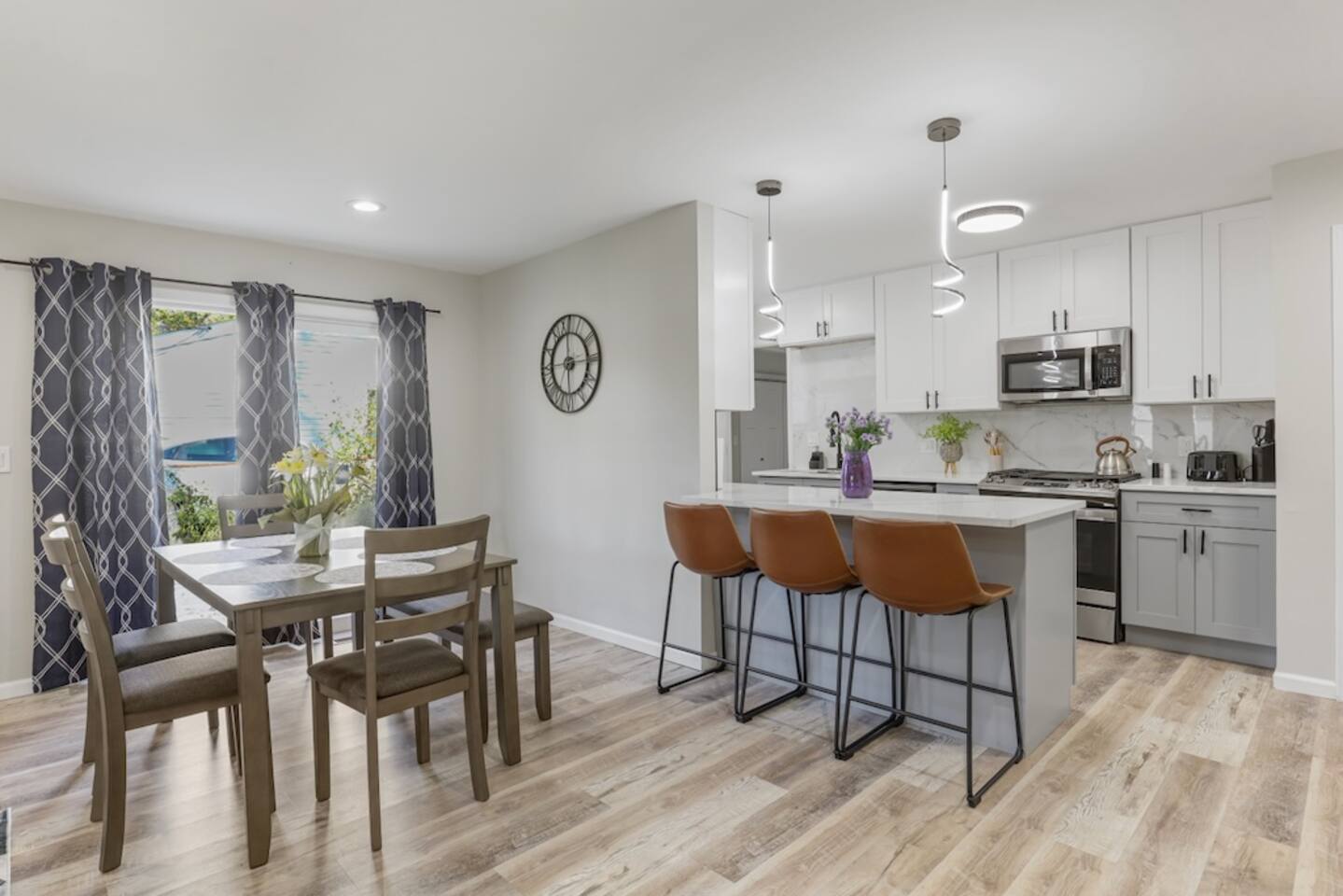 **Gourmet Open-Concept Kitchen**: At the heart of this home lies a stunning kitchen featuring a massive island that's perfect for gathering with family and friends. The brand-new cabinetry and sleek modern finishes offer both elegance and functionality. Whether you're whipping up a quick breakfast or preparing a gourmet meal, this kitchen is sure to impress. The open floor plan flows seamlessly from the kitchen into the living and dining areas, making it ideal for entertaining and spending quality time together. The space is filled with natural light, creating a warm and welcoming ambiance.