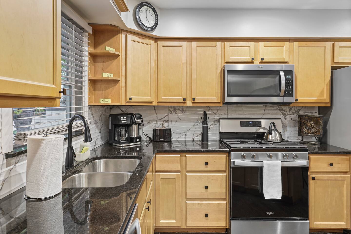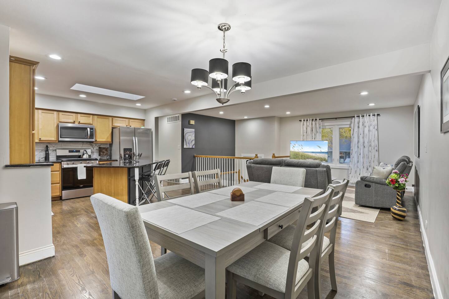 • An open-concept living room, dining room, and fully equipped kitchen create a bright and welcoming space.