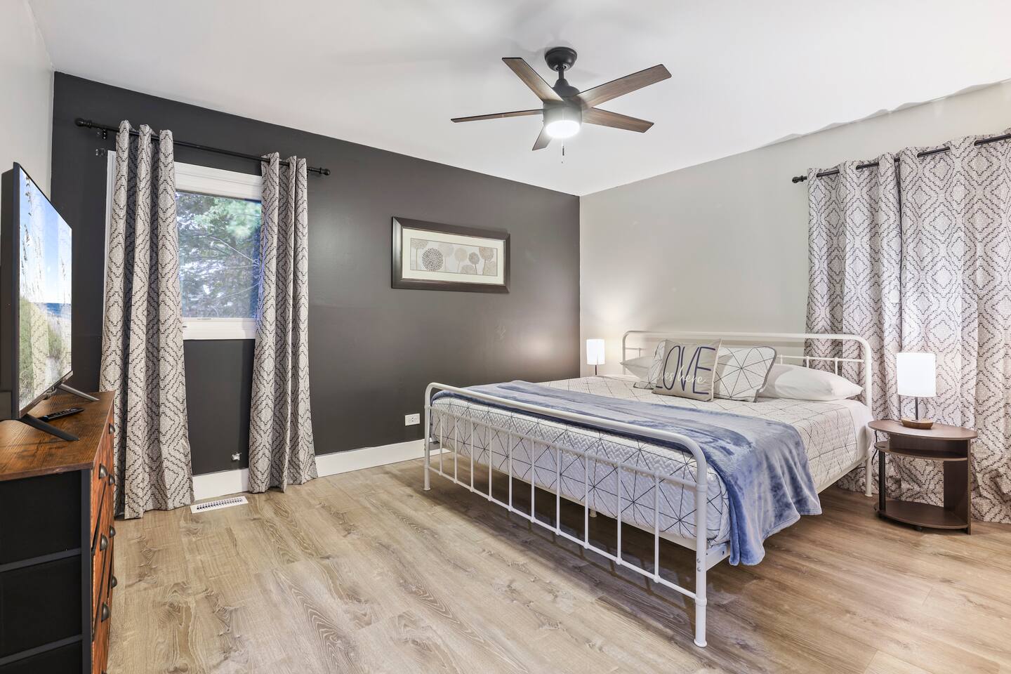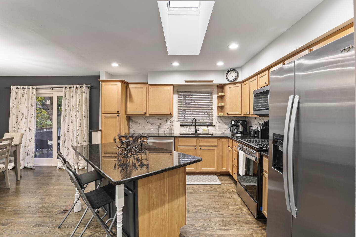 Welcome to Charisma, a spacious 5 bedroom raised ranch in Glendale Heights featuring 5 king beds, 2 full bathrooms, and ample room for families or business travelers. The upstairs offers 3 bedrooms, a full bath with a tub, and an open-concept living, dining, and kitchen area that opens to a large deck with a gas grill and views of the fully fenced backyard. The lower level includes 2 additional bedrooms, a second bathroom, and direct access through the attached two-car garage.