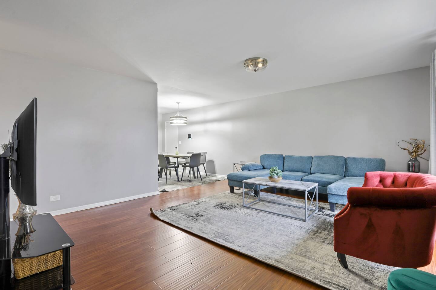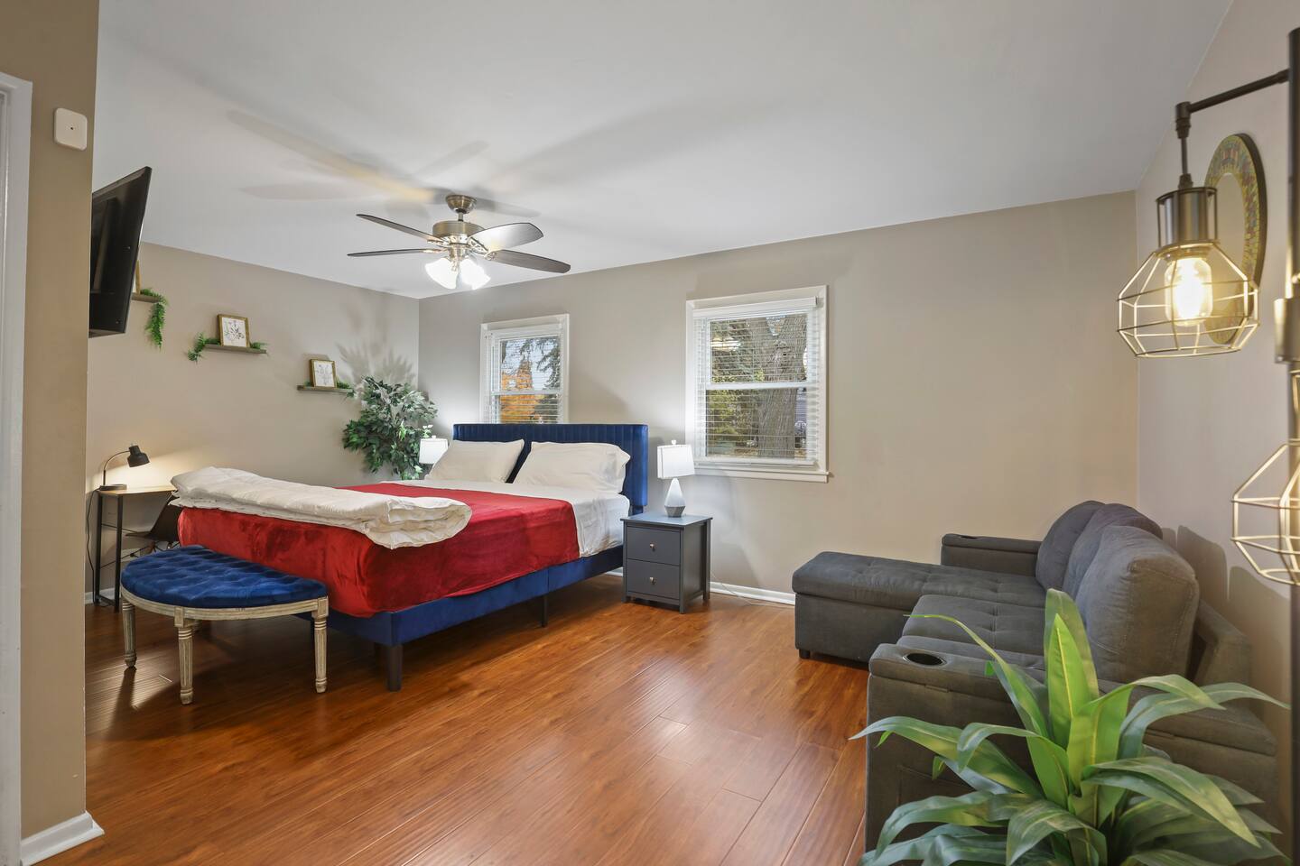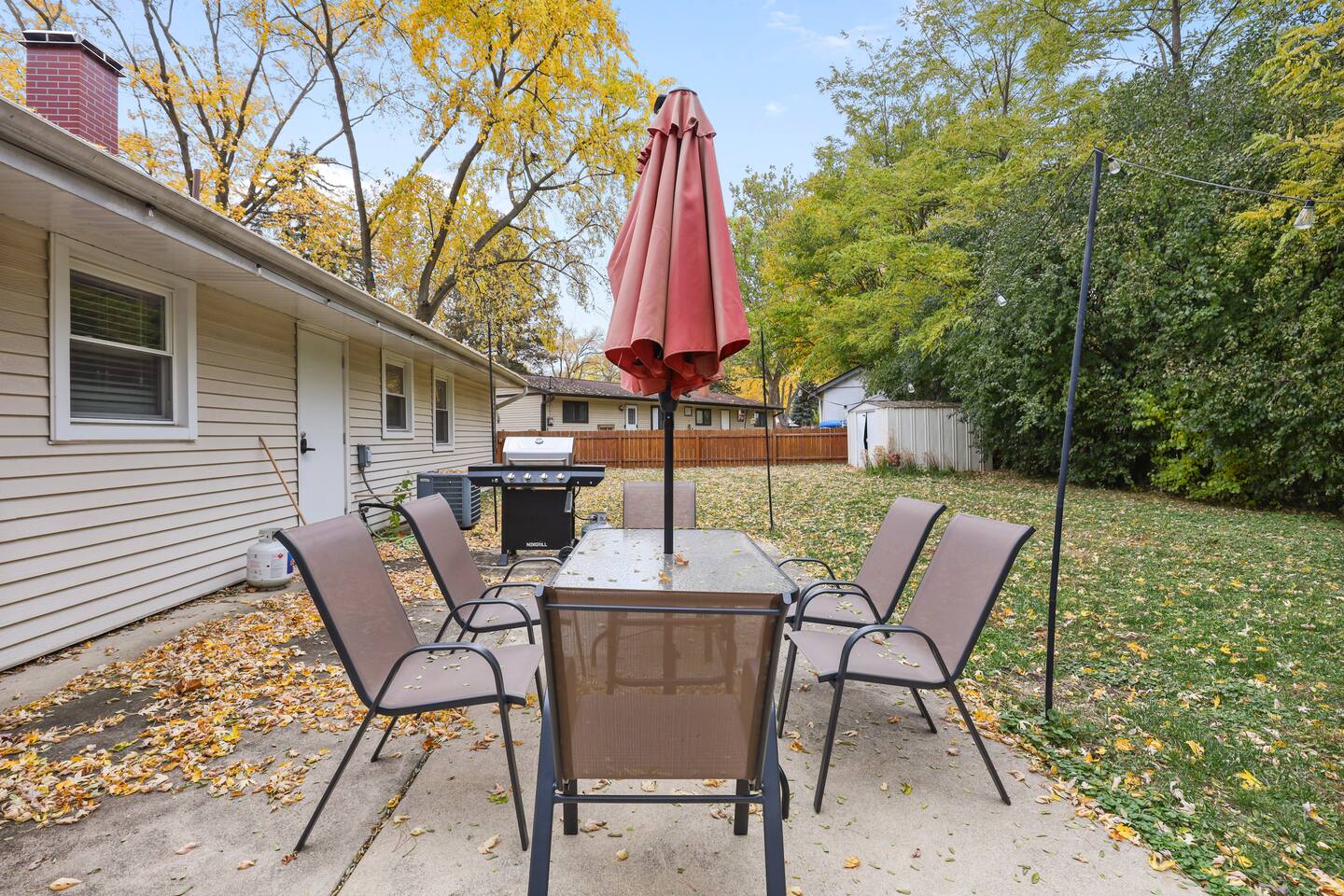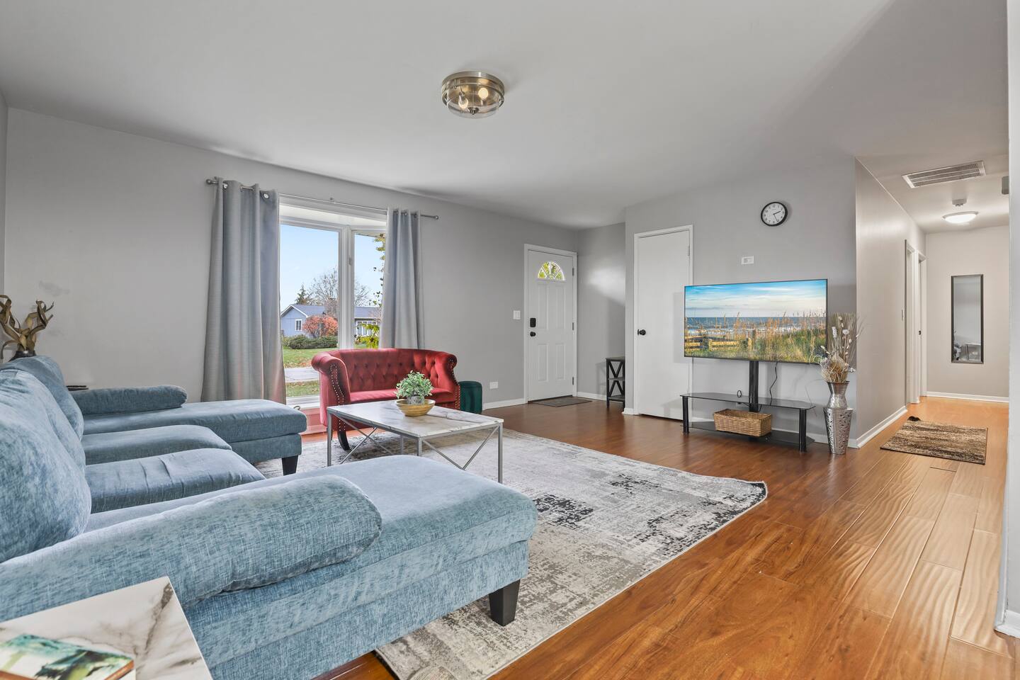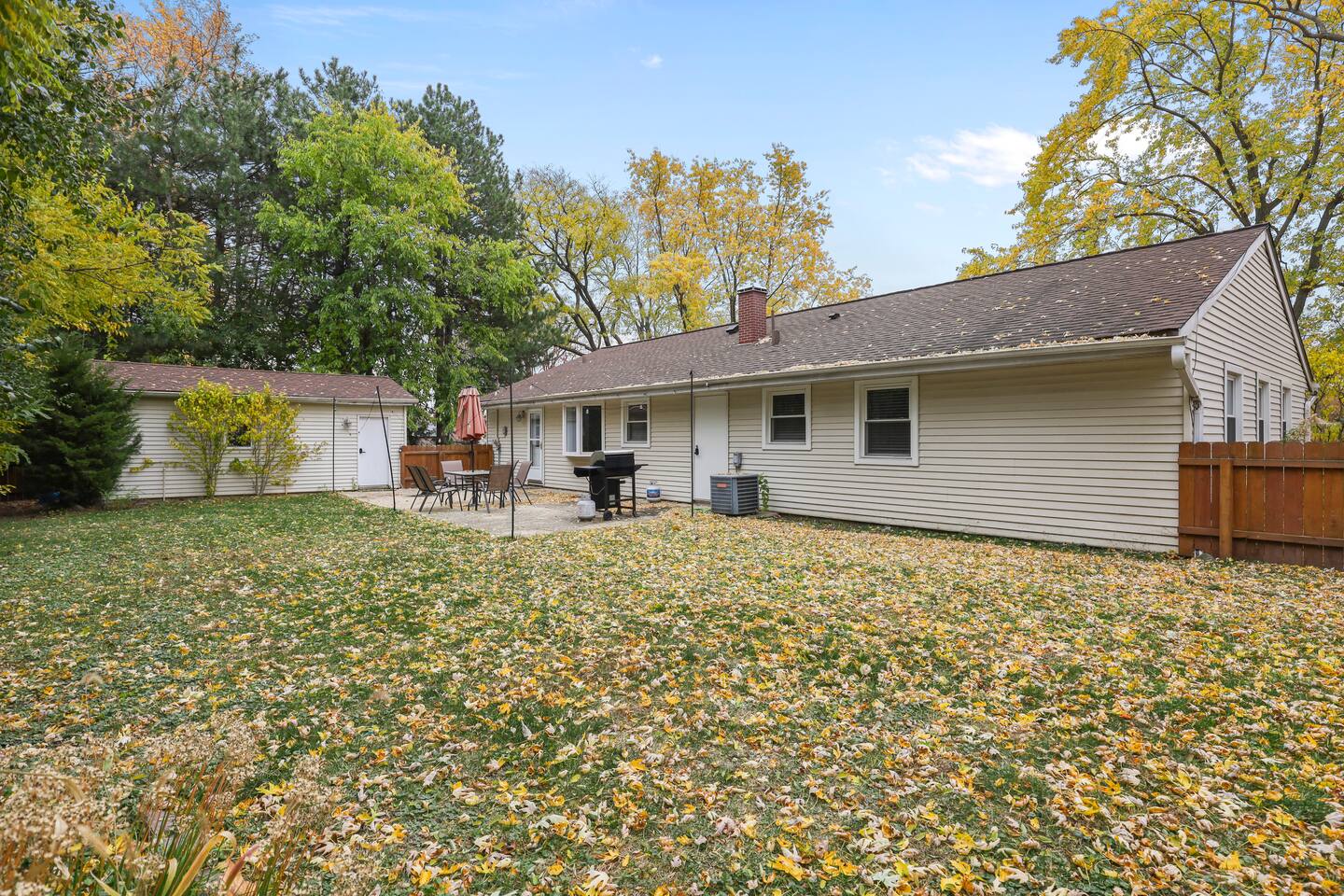 This modern three-bedroom, two-bathroom ranch in Darien, Illinois, is perfect for families or groups visiting the area. The open-concept layout allows the brand-new kitchen, complete with a farmhouse sink, stainless steel appliances, and modern finishes, to flow seamlessly into the dining area and spacious living room. Two bedrooms are outfitted with luxurious king-size beds, while the third has two twin beds, making it ideal for children or additional guests. For larger groups, we also provide a queen air mattress and a pullout sofa sleeper for added flexibility. The fully fenced backyard offers a relaxing retreat with patio furniture for lounging and a playset to keep kids entertained.