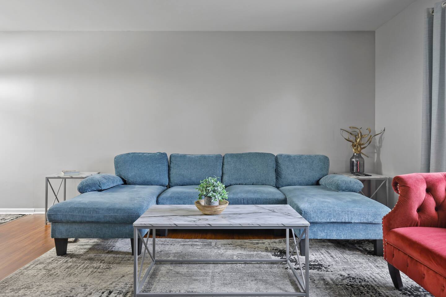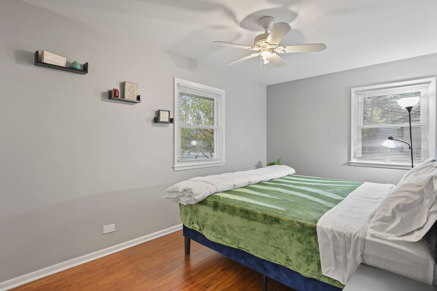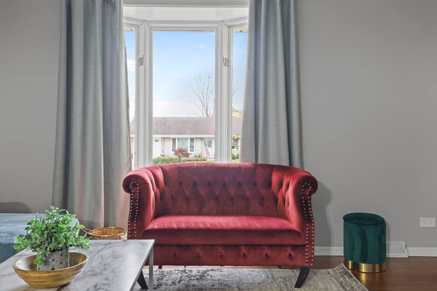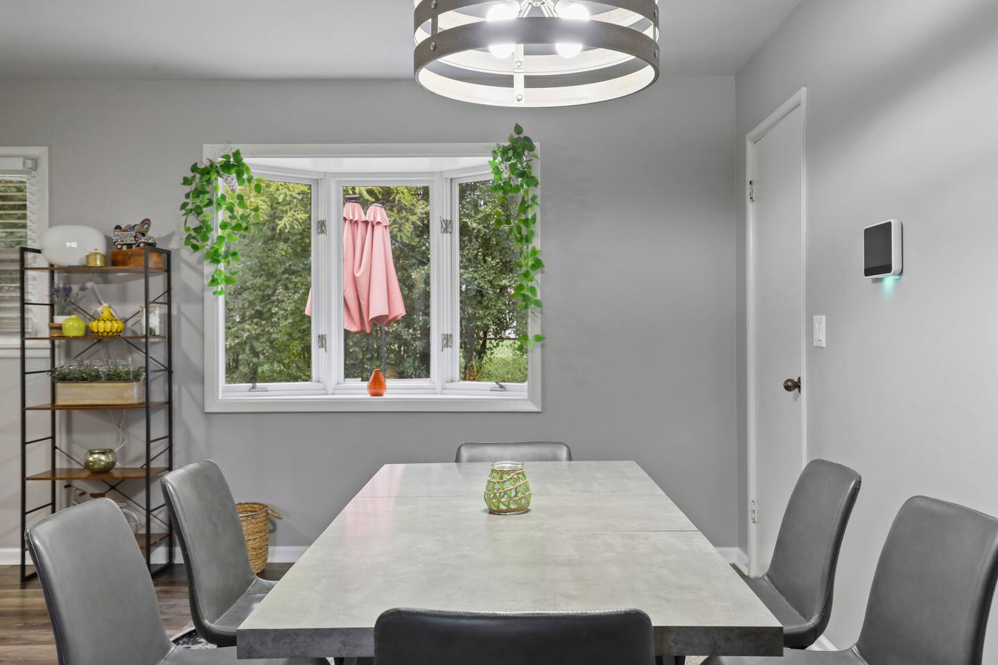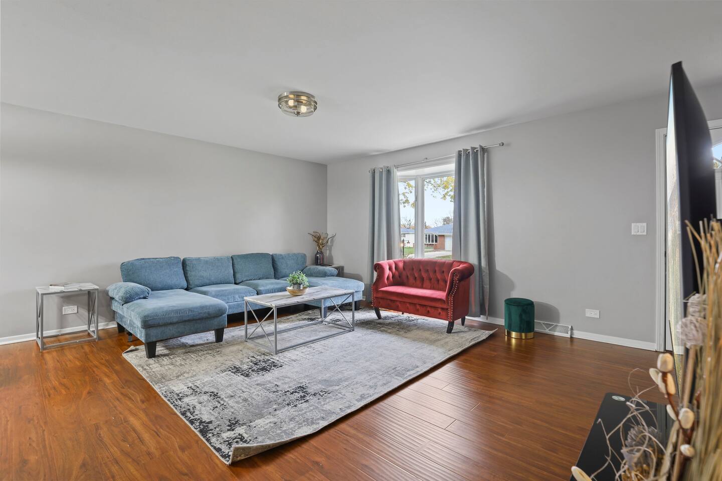 This modern three-bedroom, two-bathroom ranch in Darien, Illinois, is perfect for families or groups visiting the area. The open-concept layout allows the brand-new kitchen, complete with a farmhouse sink, stainless steel appliances, and modern finishes, to flow seamlessly into the dining area and spacious living room. Two bedrooms are outfitted with luxurious king-size beds, while the third has two twin beds, making it ideal for children or additional guests. For larger groups, we also provide a queen air mattress and a pullout sofa sleeper for added flexibility. The fully fenced backyard offers a relaxing retreat with patio furniture for lounging and a playset to keep kids entertained.