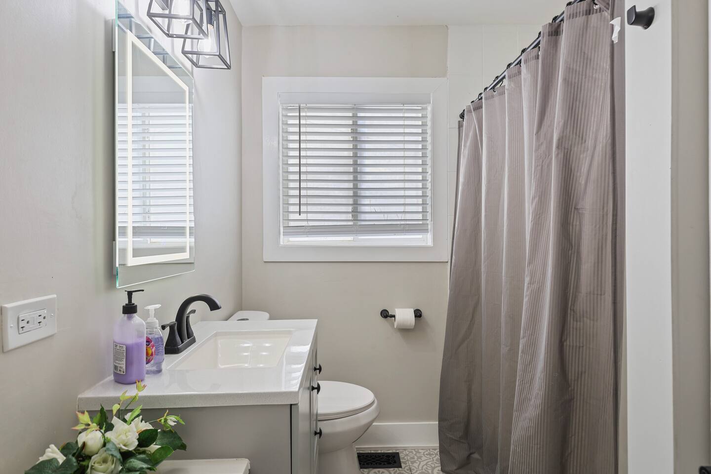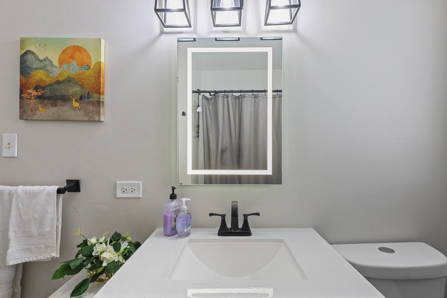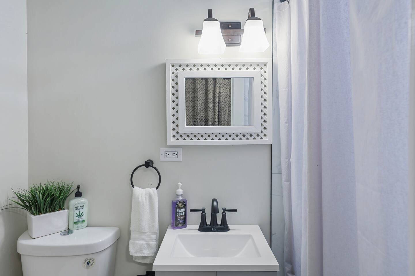 2 modern, full bathrooms stocked with essentials for your stay including but not limited to soap, shampoo and conditioner.