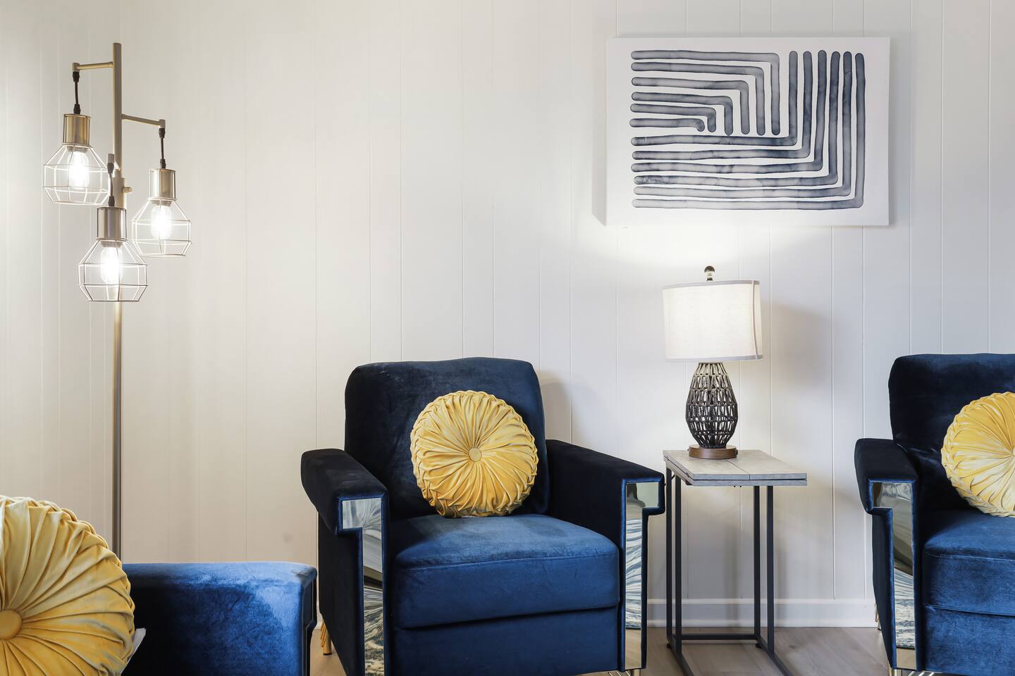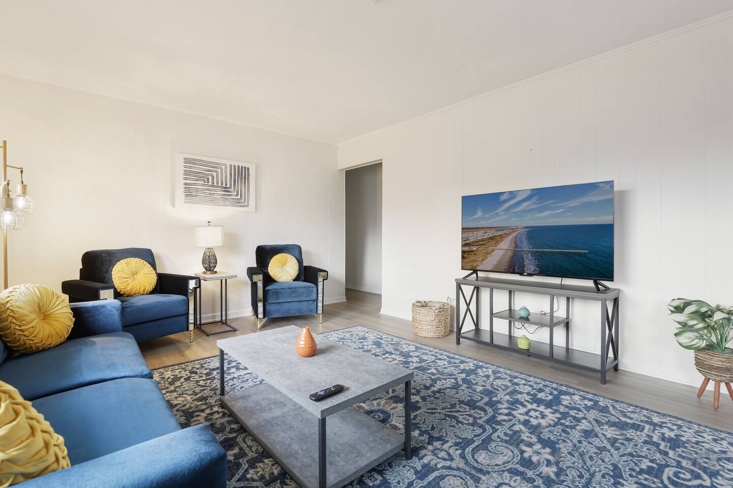 The main living room is a bright and comfy hangout zone featuring a blue-toned couch and chairs, plus a Smart TV for streaming your favorites.
