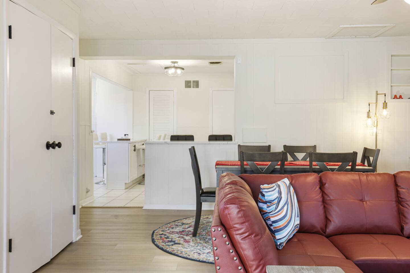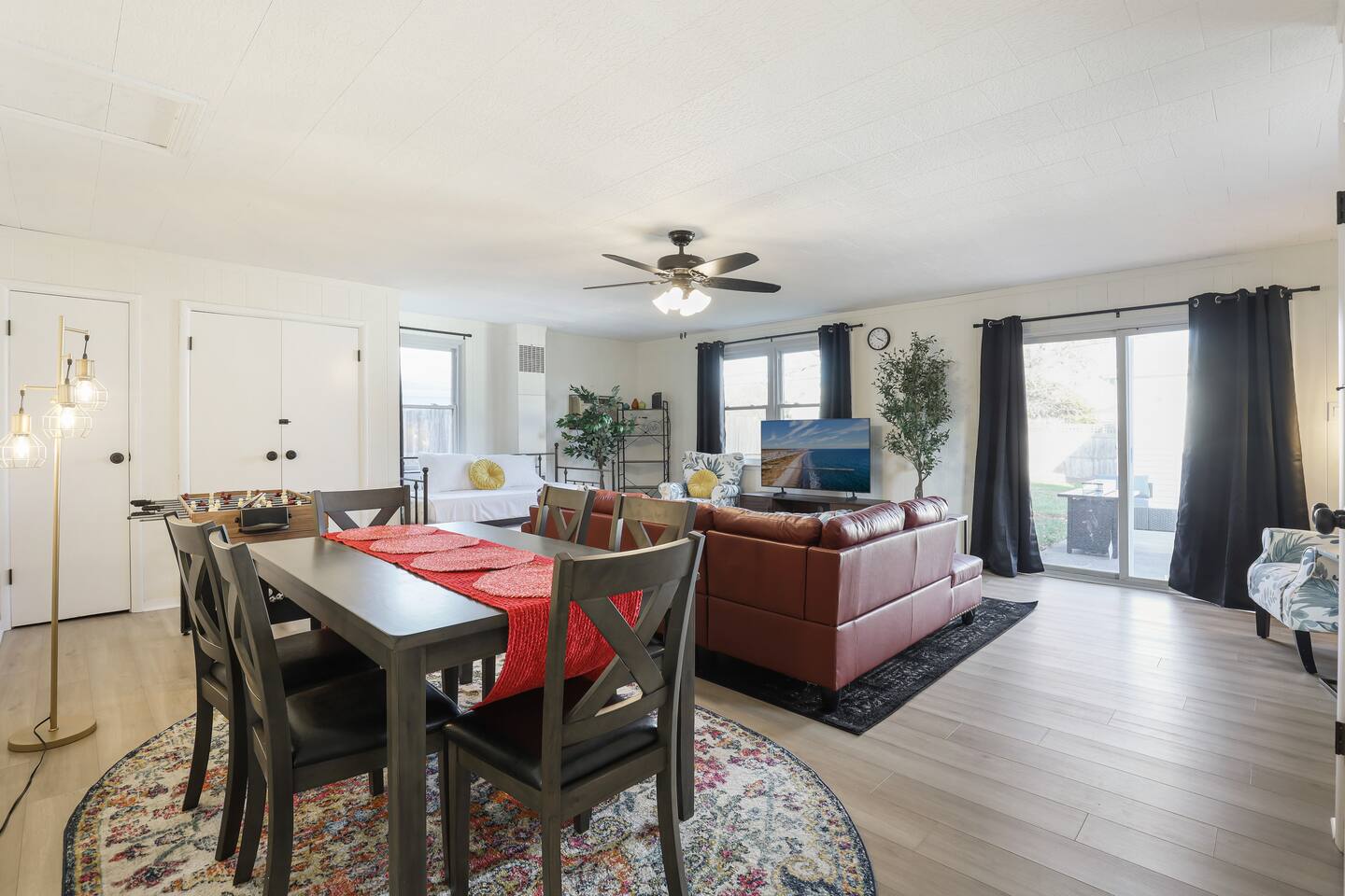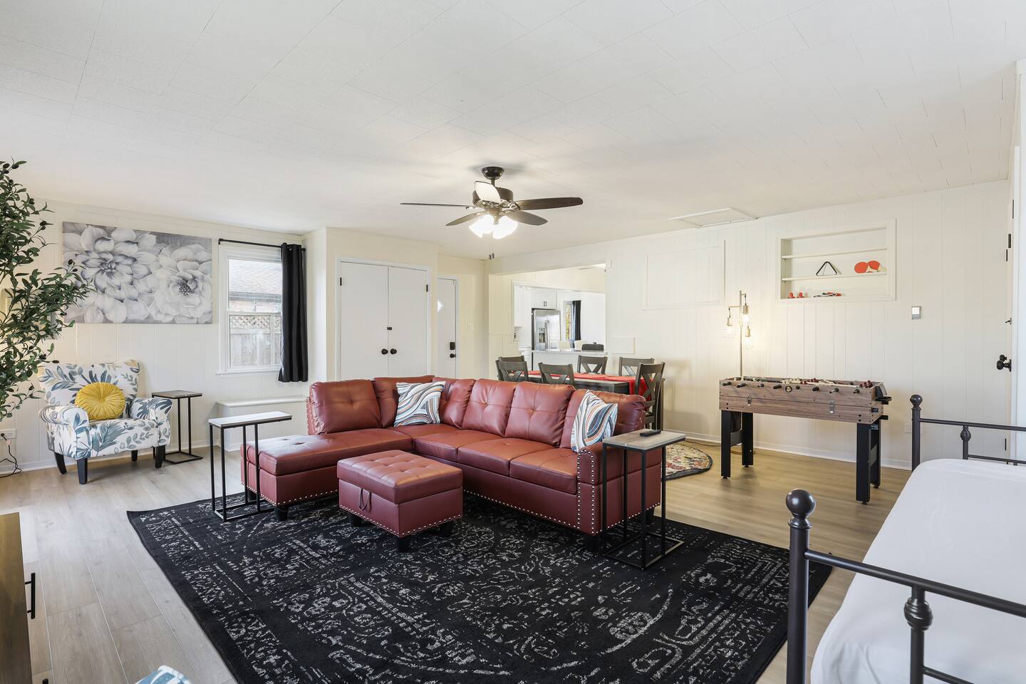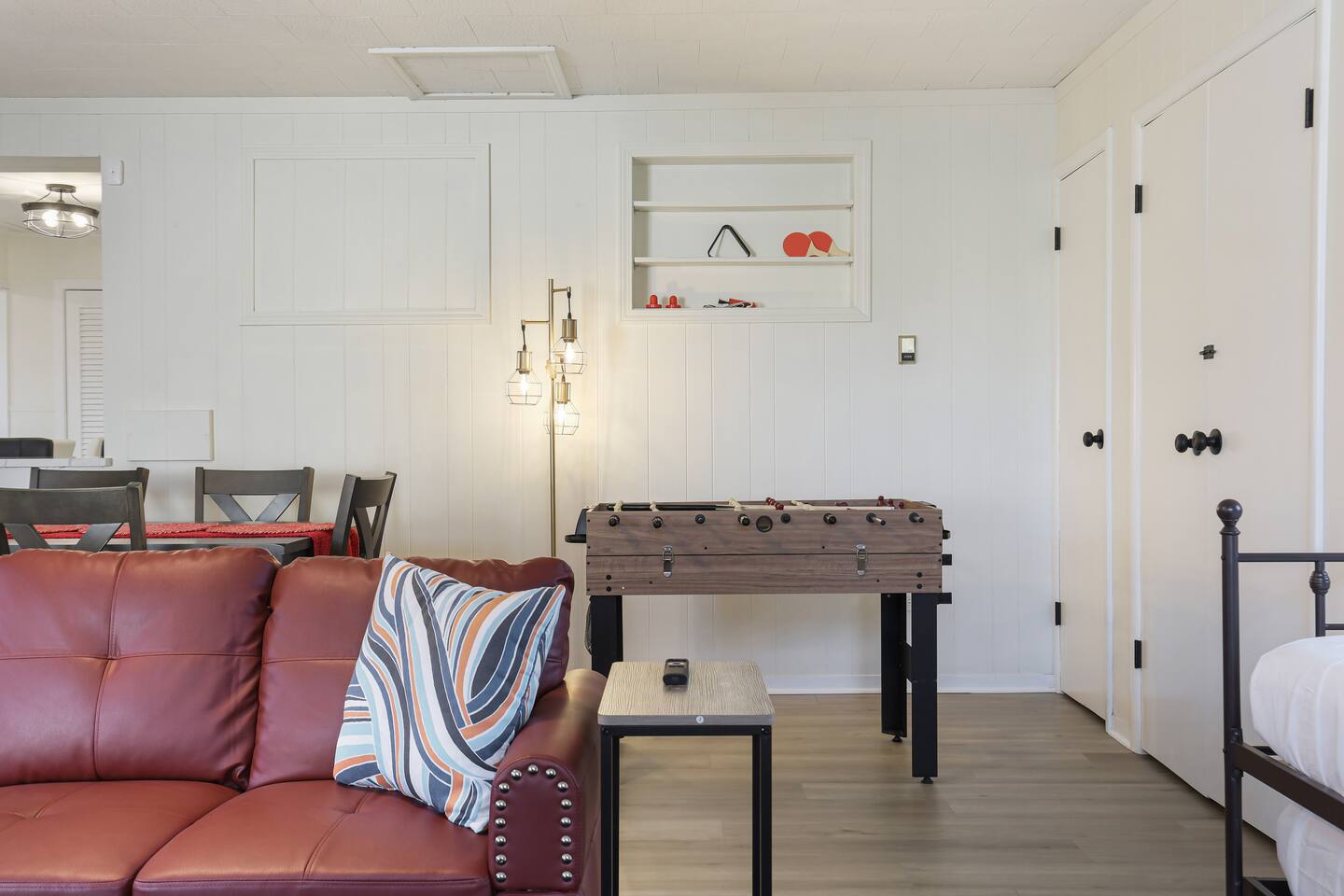 The second living/dining combo room offers even more space to spread out, complete with a large sectional, dining table, foosball table, and even a trundle bed with two twin mattresses for extra guests. Please note: this room is a home addition and has its own heating/AC unit to keep things comfortable.