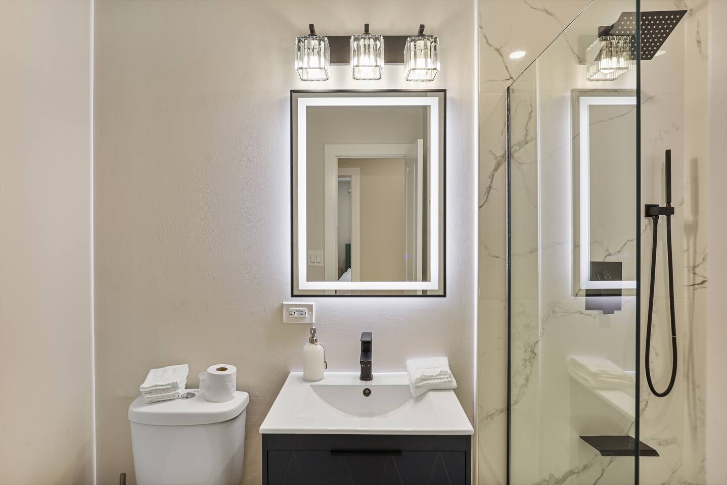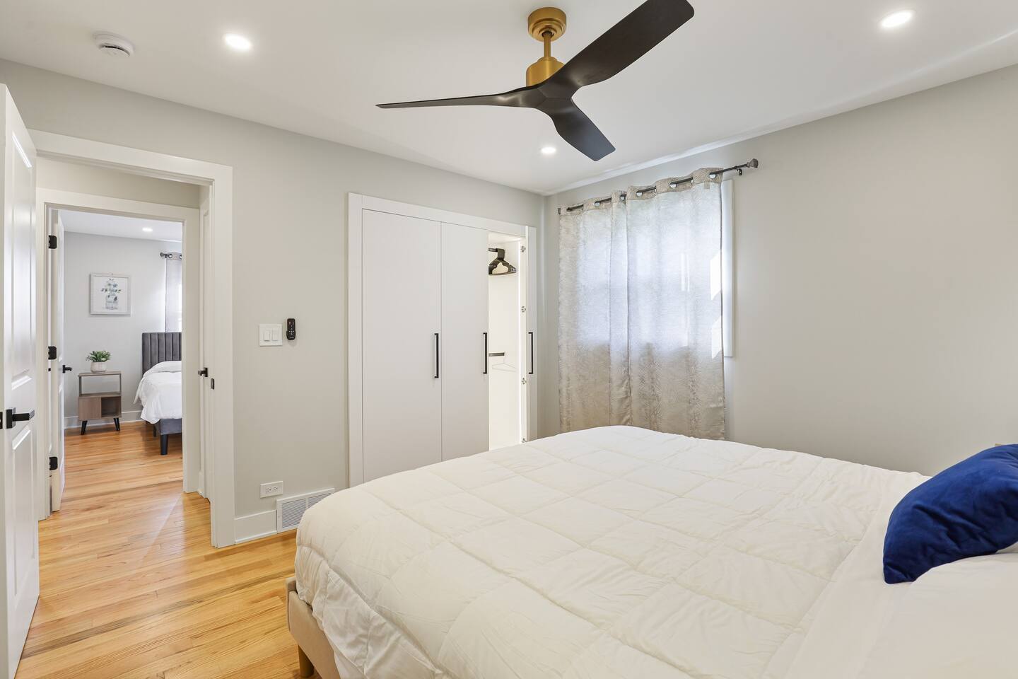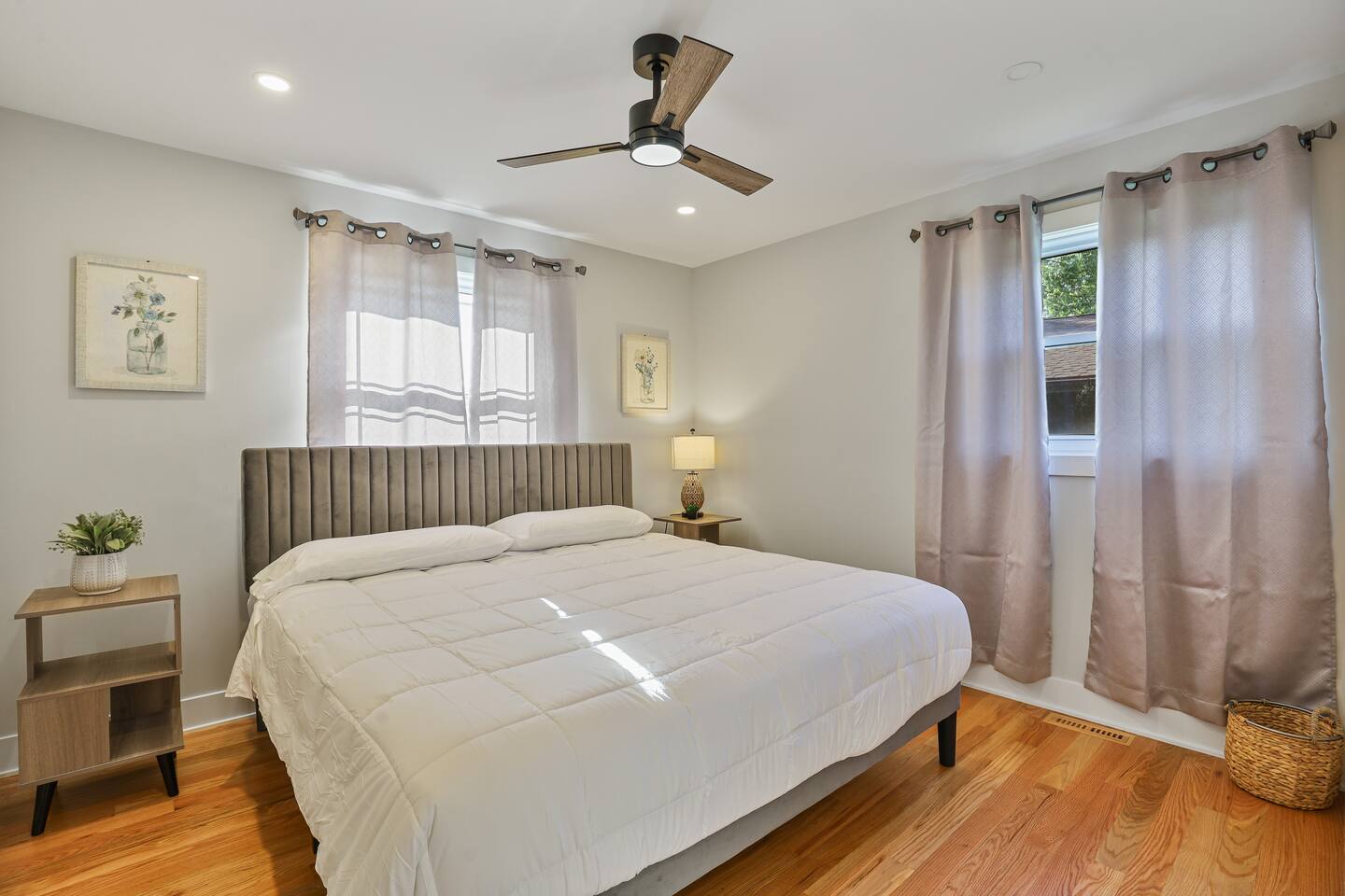 All three upstairs bedrooms feature plush king-size memory foam beds, sleek touch lamps with built-in phone charging, and thoughtful touches to make you feel at home. The master suite boasts its own private bathroom, while the two additional bedrooms share a full hallway bath. One of the bedrooms even has a dedicated workspace, complete with high-speed internet—perfect for remote work or catching up on emails.