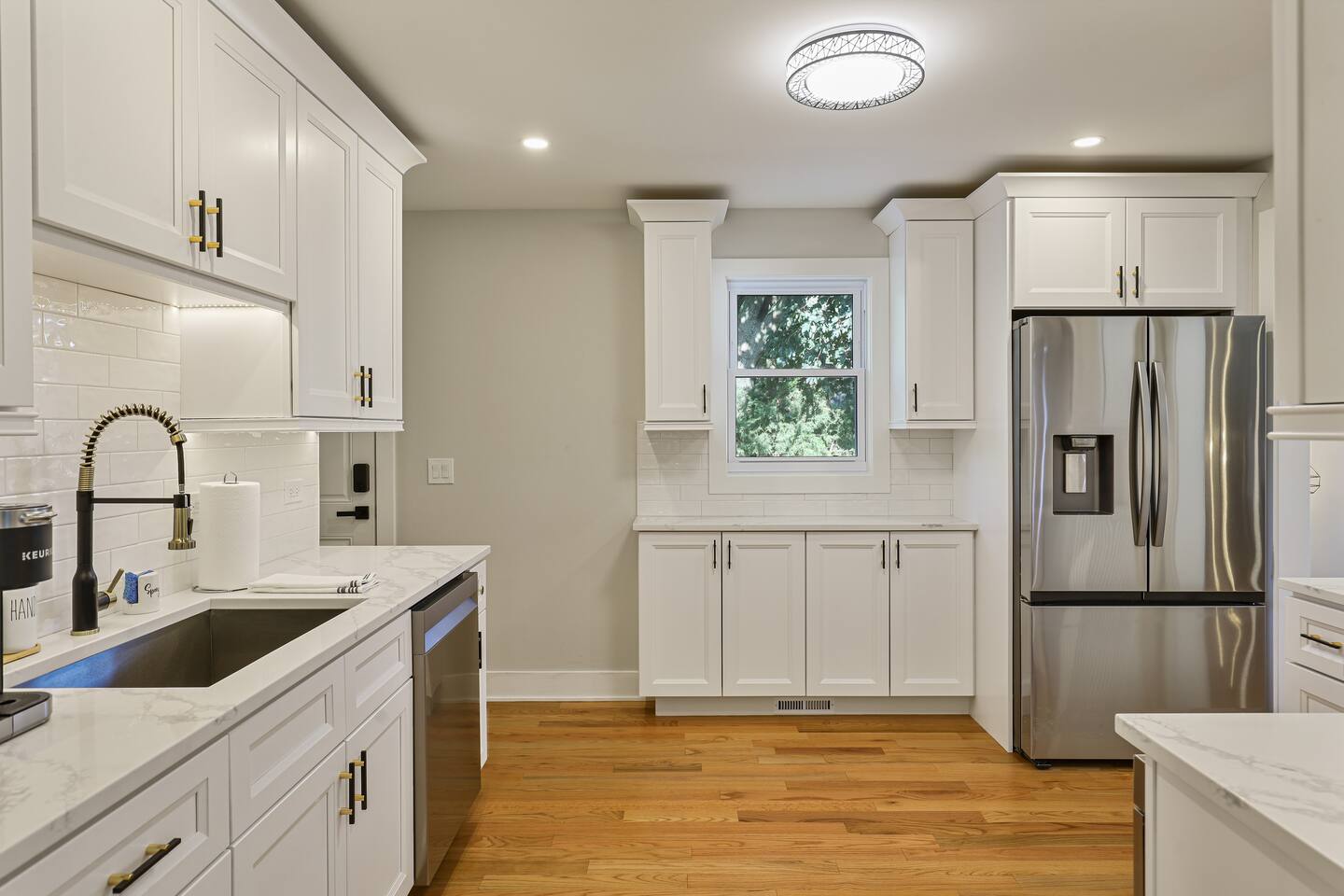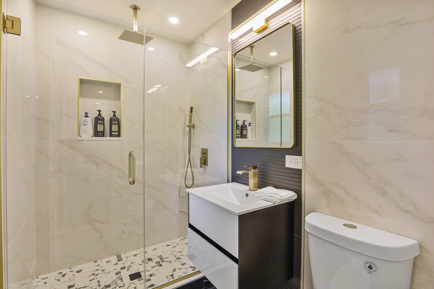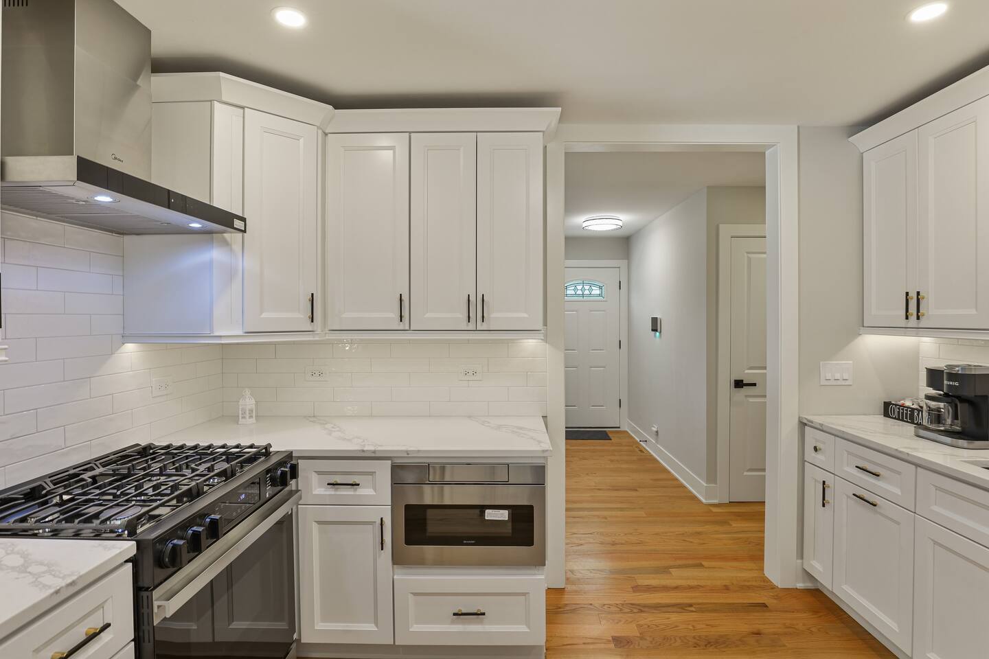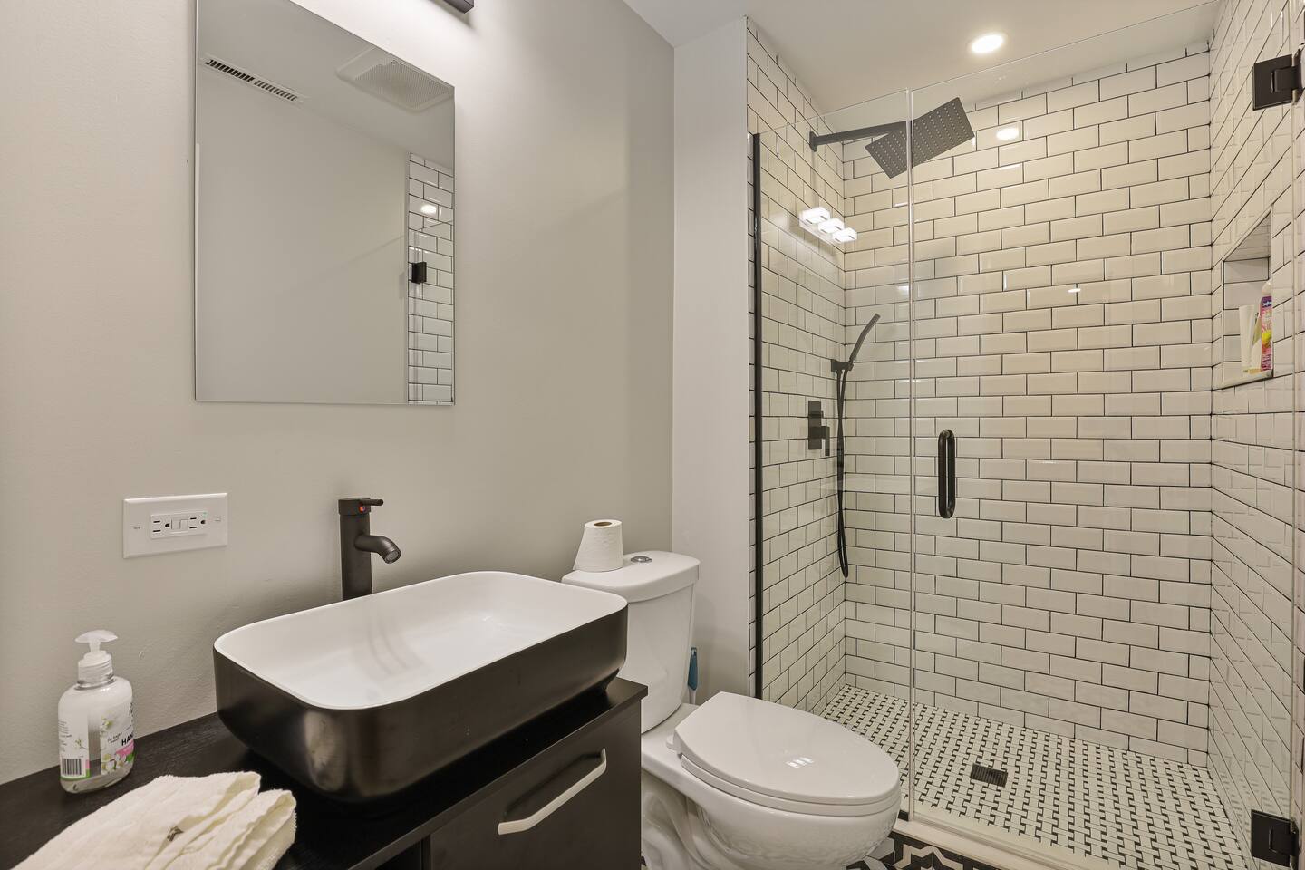 All three upstairs bedrooms feature plush king-size memory foam beds, sleek touch lamps with built-in phone charging, and thoughtful touches to make you feel at home. The master suite boasts its own private bathroom, while the two additional bedrooms share a full hallway bath. One of the bedrooms even has a dedicated workspace, complete with high-speed internet—perfect for remote work or catching up on emails.
