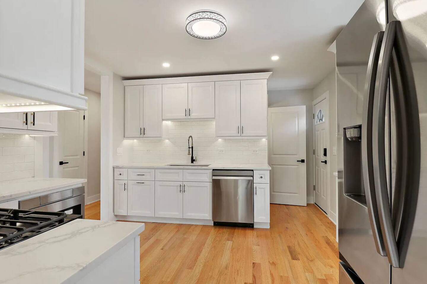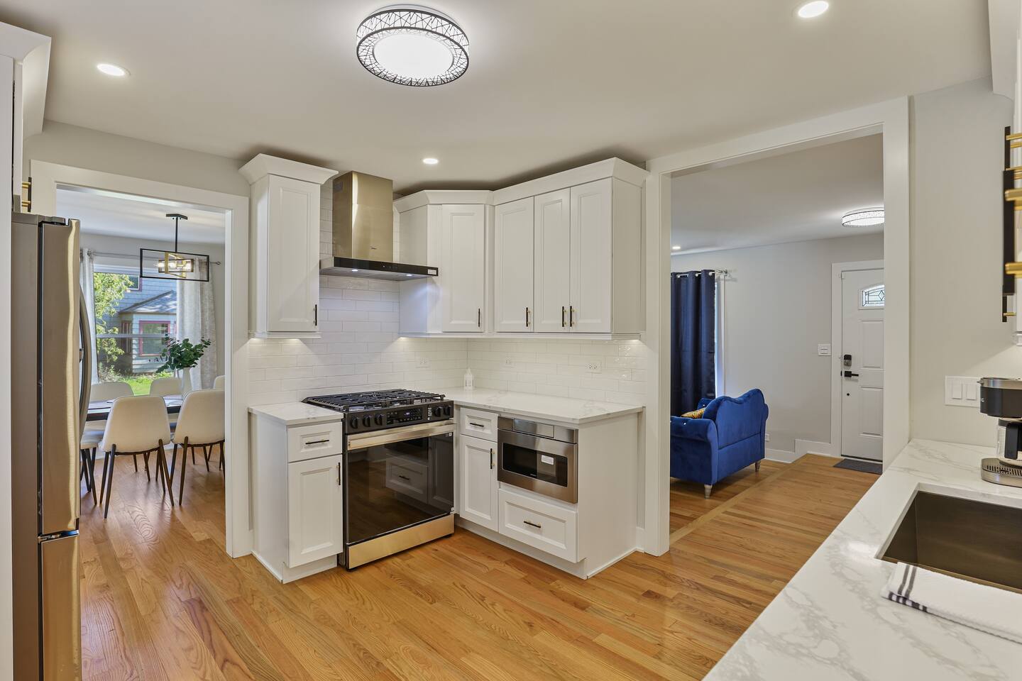 The heart of the home features a modern, fully stocked kitchen that flows effortlessly into the open-concept dining and living area. Cozy up by the electric fireplace, set against a stunning accent wall, or enjoy a meal together around the spacious dining table.