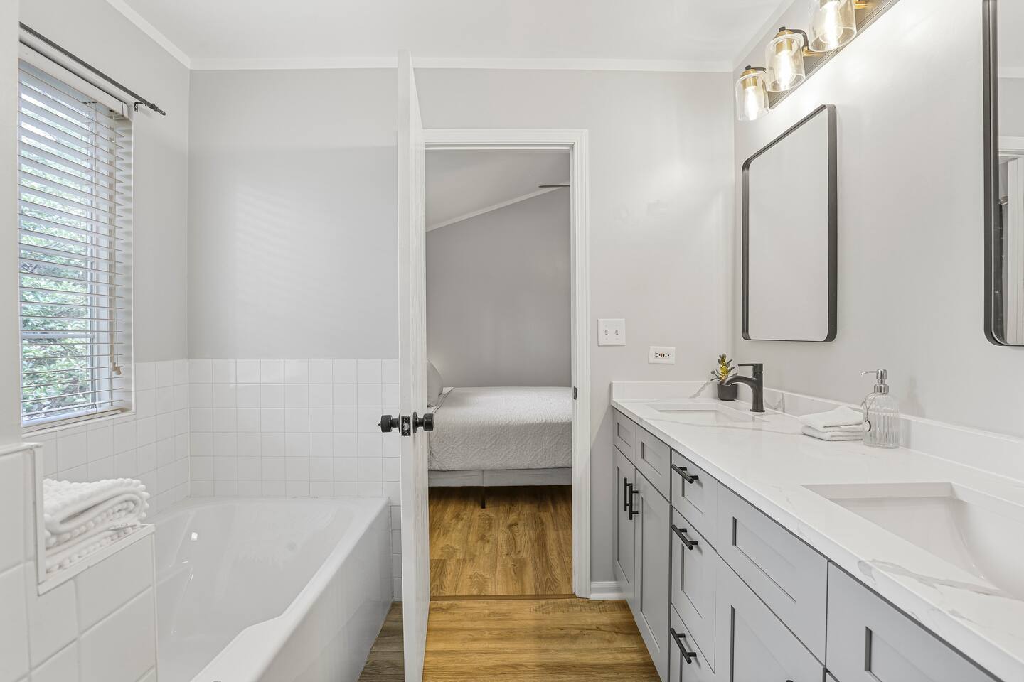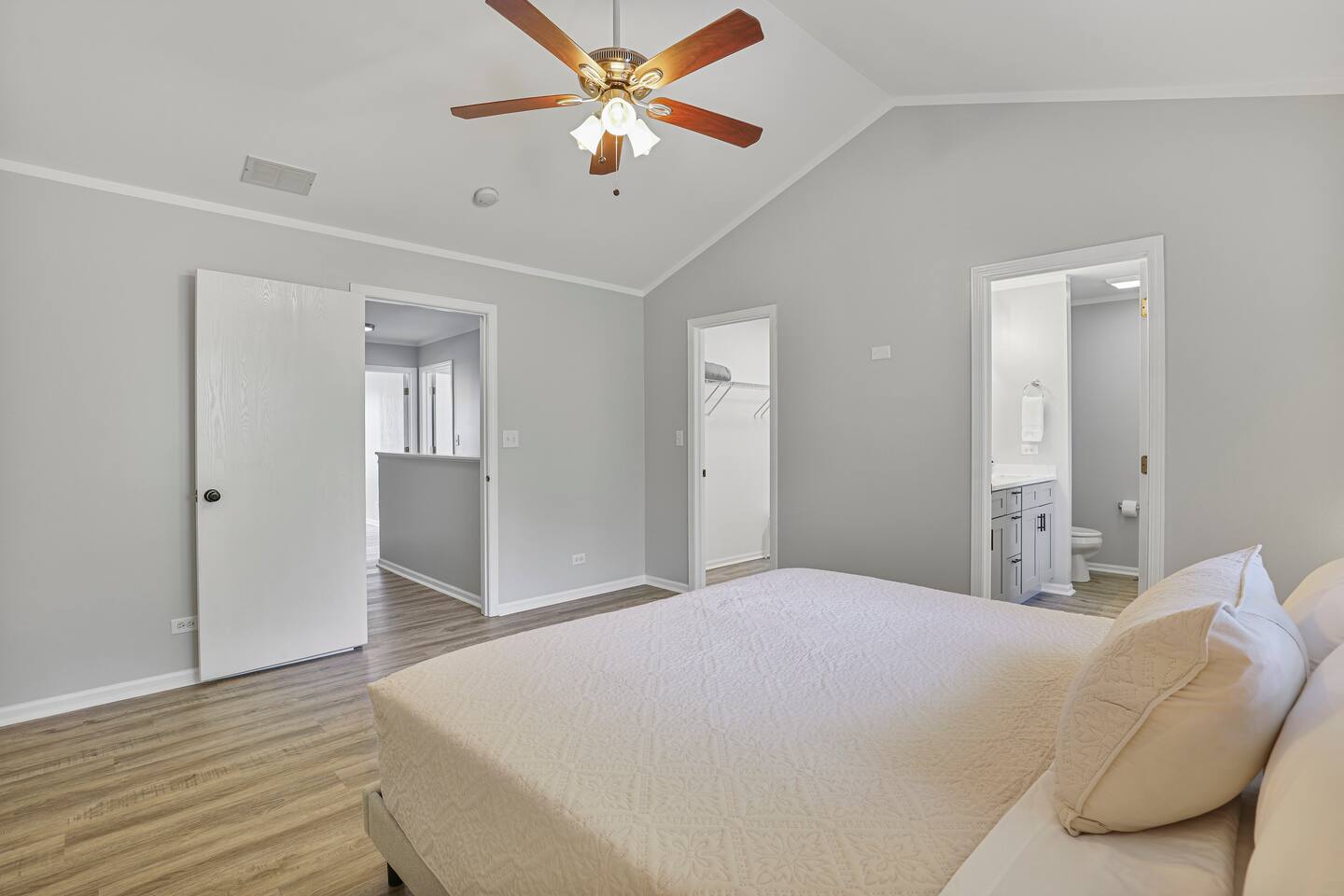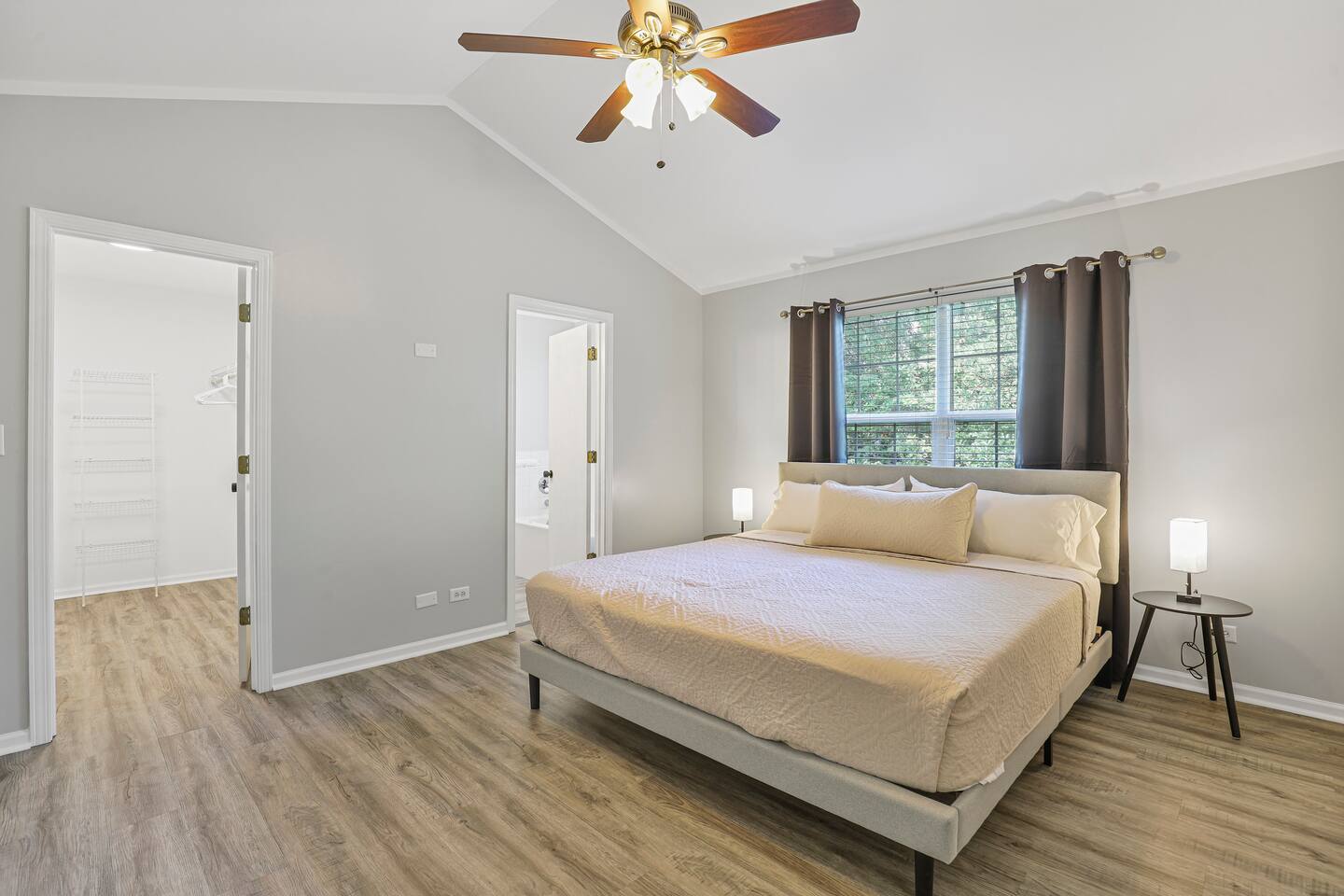 Upstairs, you’ll find three spacious bedrooms. The highlight is the oversized master suite, complete with a massive walk-in closet and a private en suite bathroom featuring a soaking tub and separate shower. The other two bedrooms are warm and inviting, making this home an excellent fit for families, business travelers, or groups looking for space to spread out.