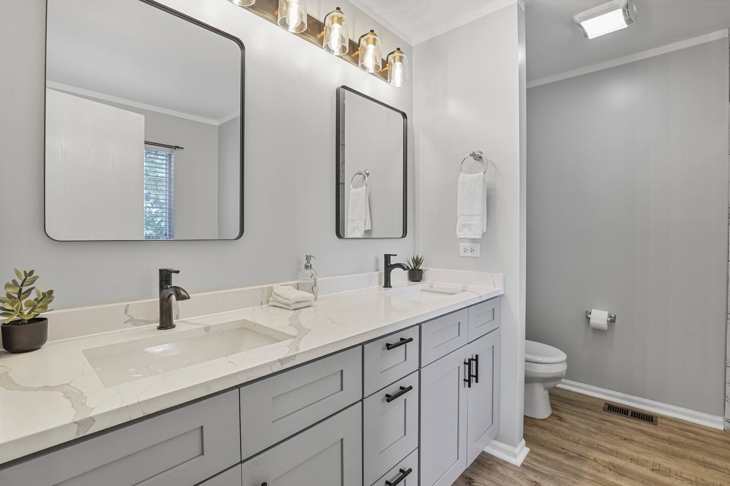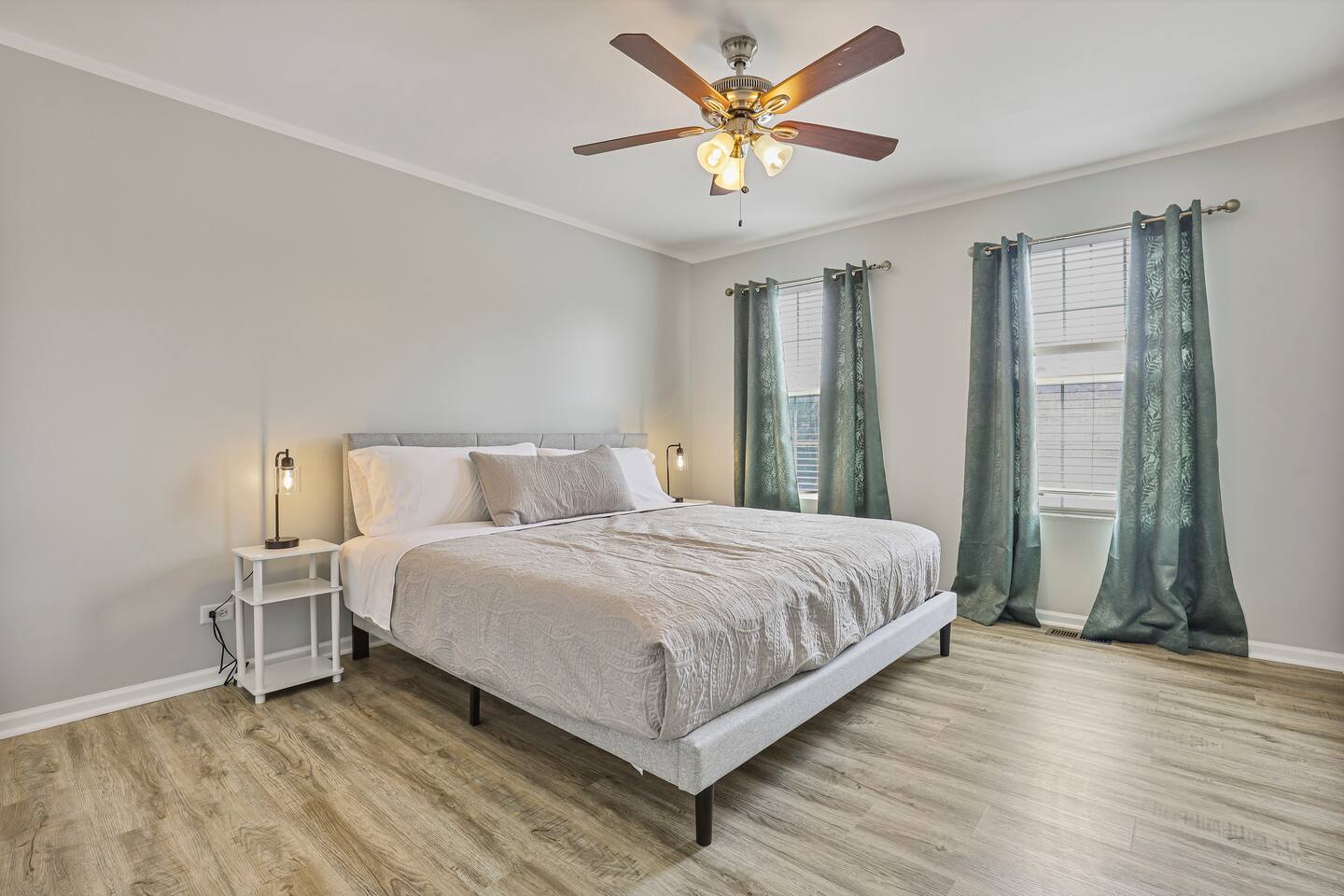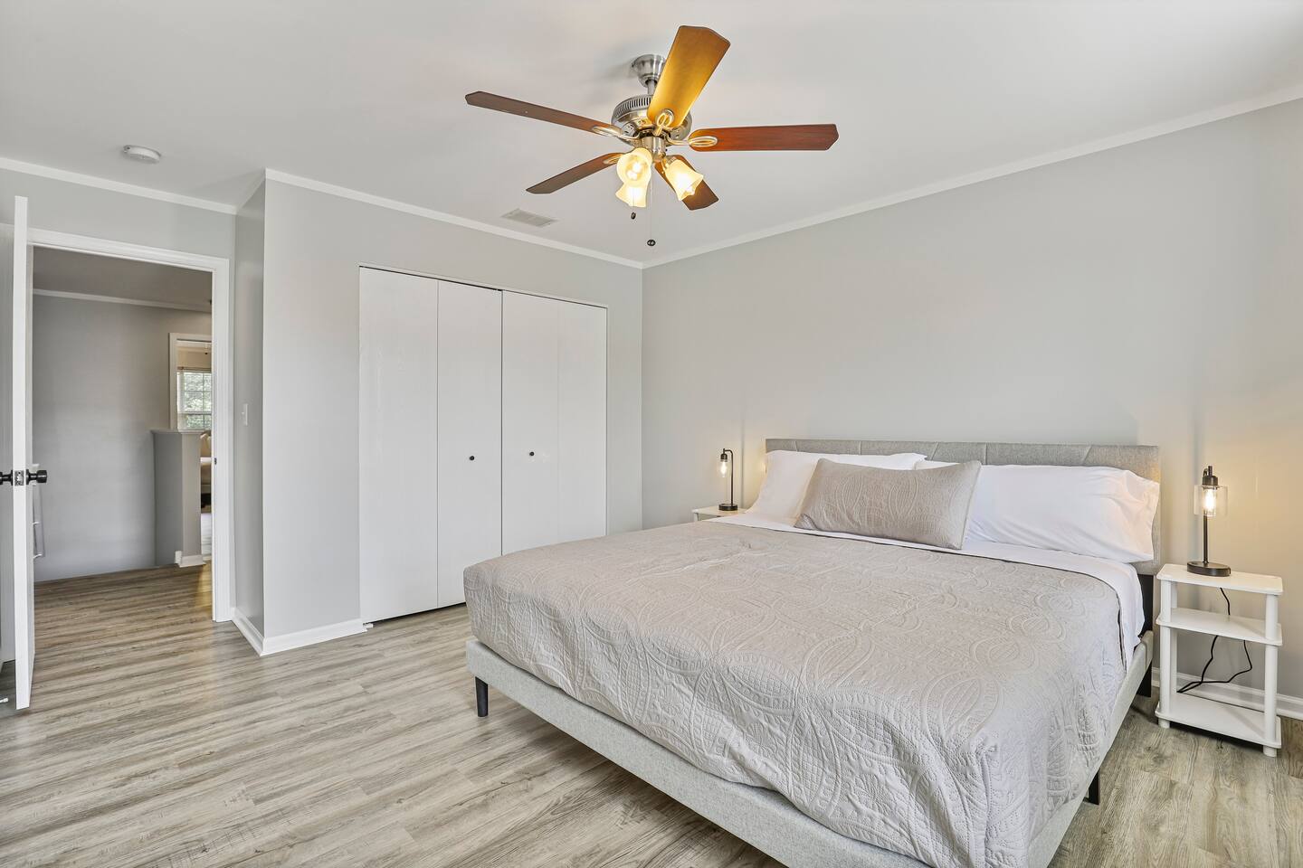 Upstairs, you’ll find three spacious bedrooms. The highlight is the oversized master suite, complete with a massive walk-in closet and a private en suite bathroom featuring a soaking tub and separate shower. The other two bedrooms are warm and inviting, making this home an excellent fit for families, business travelers, or groups looking for space to spread out.