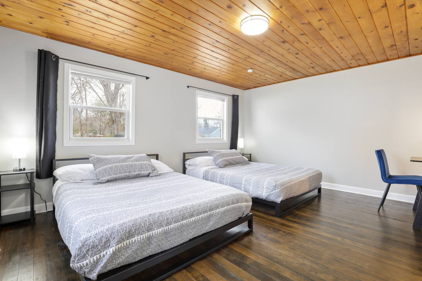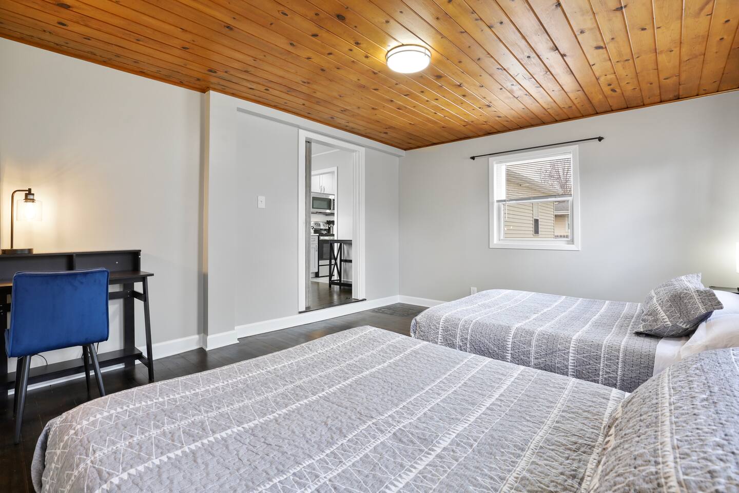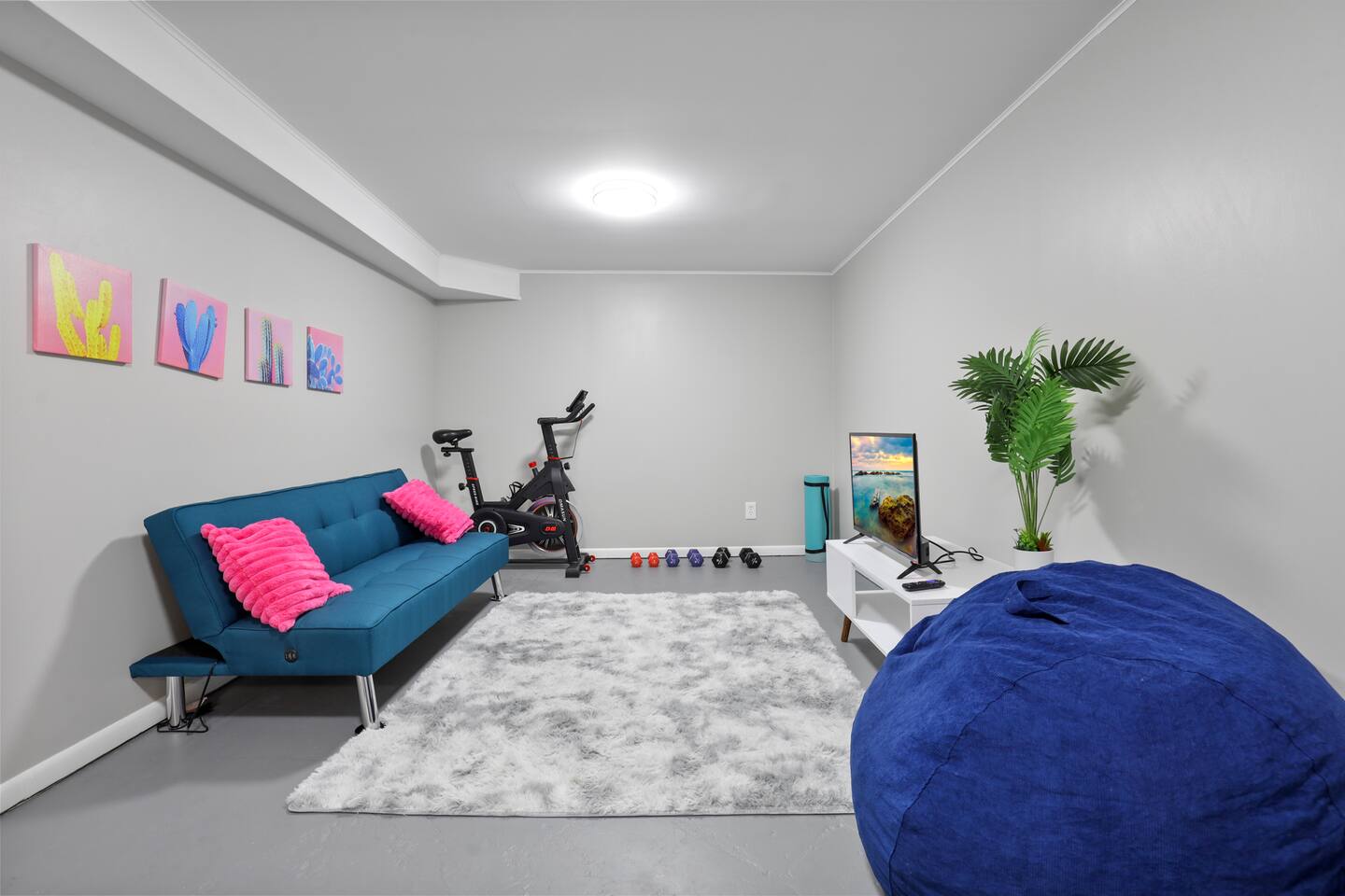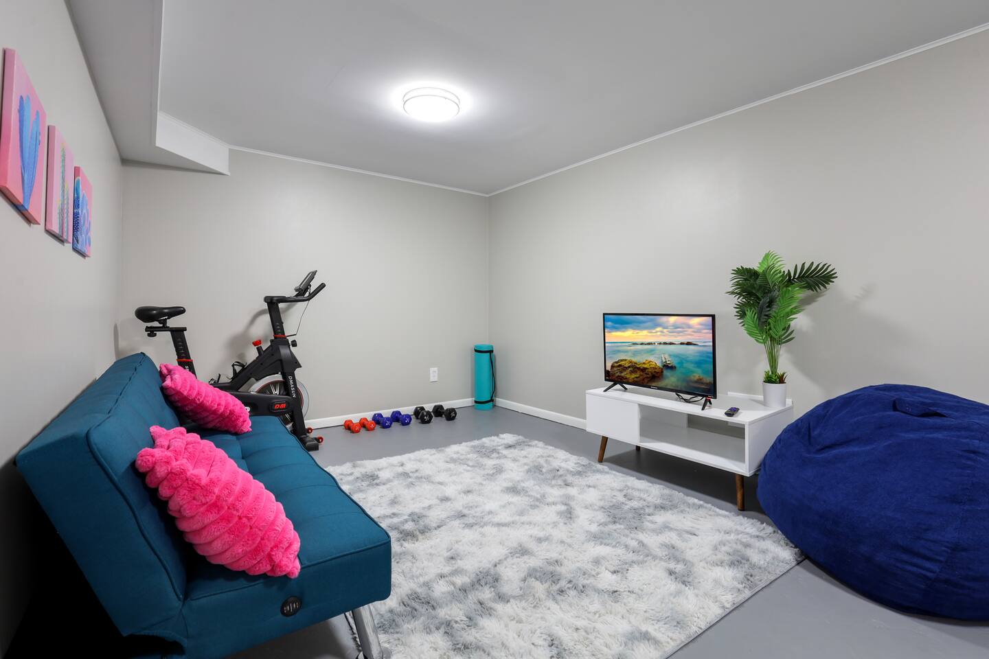 This home has four bedrooms all on the main level. Two bedrooms have king sized beds, one bedroom has a queen sized bed, and the last bedroom has two queen sized beds. In the basement is our workout equipment.