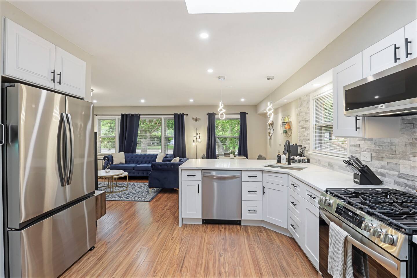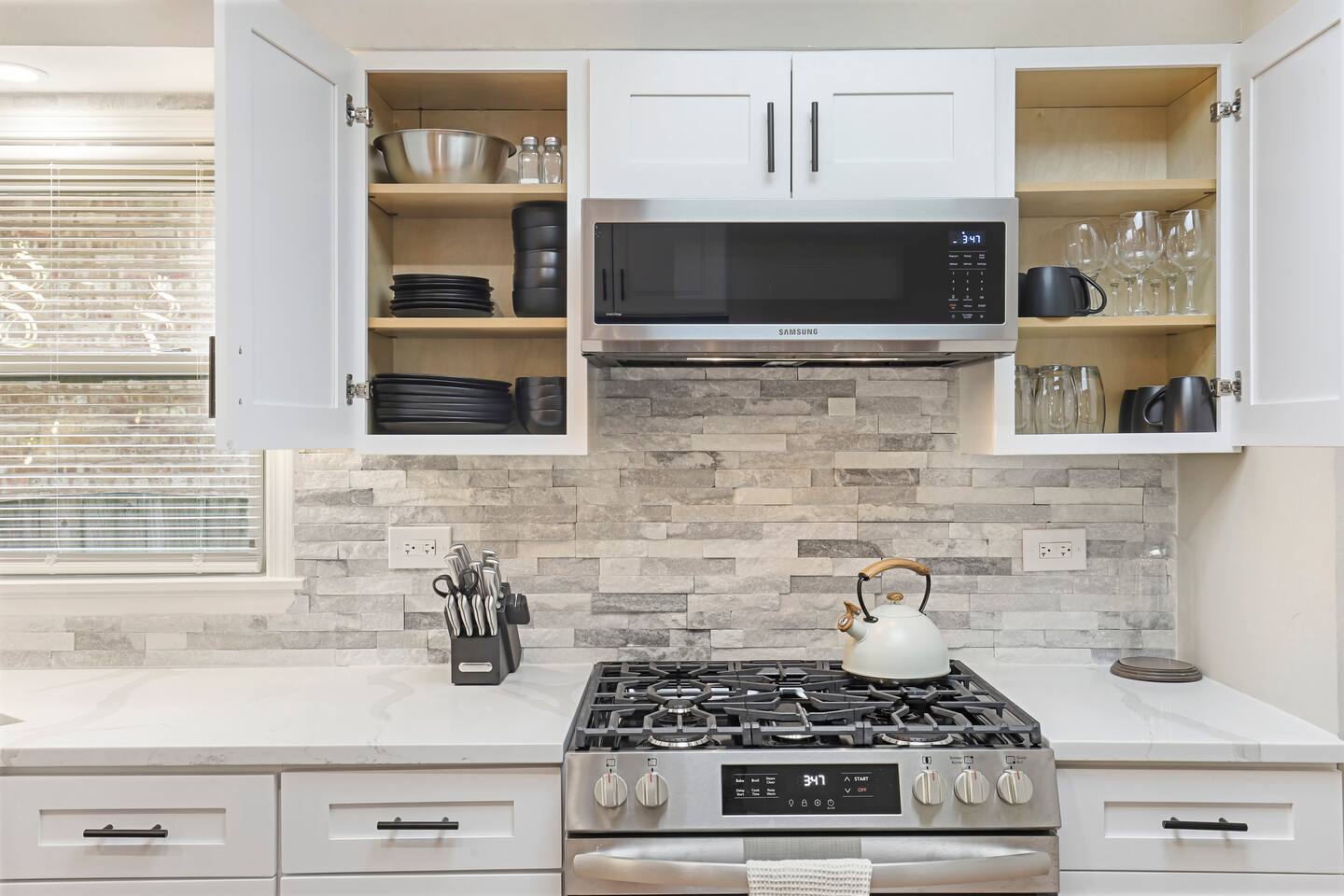 ⢠Fully stocked kitchen with granite countertops, stainless steel appliances, cookware, utensils, and essentials for preparing meals