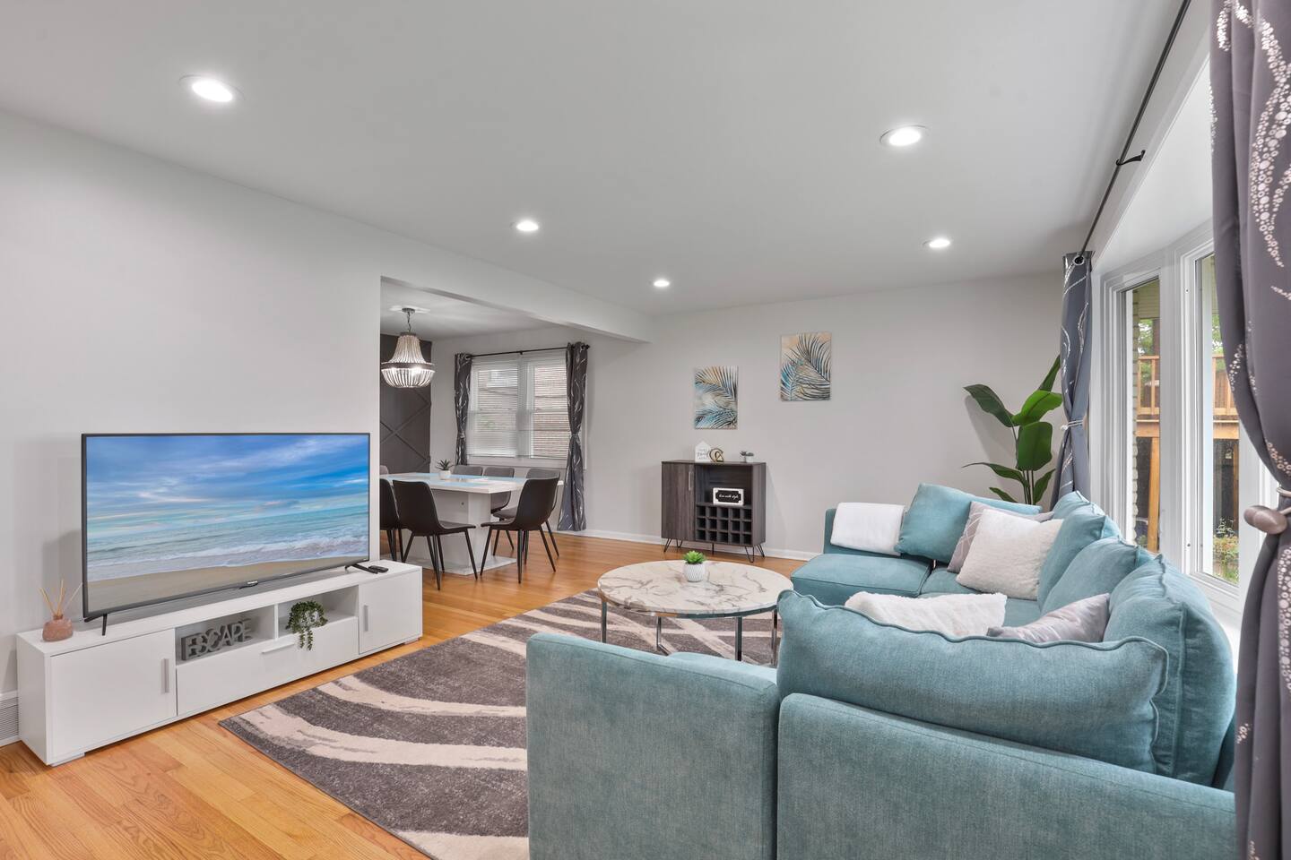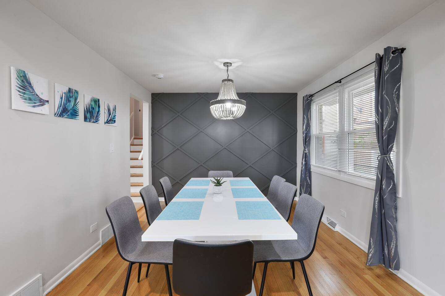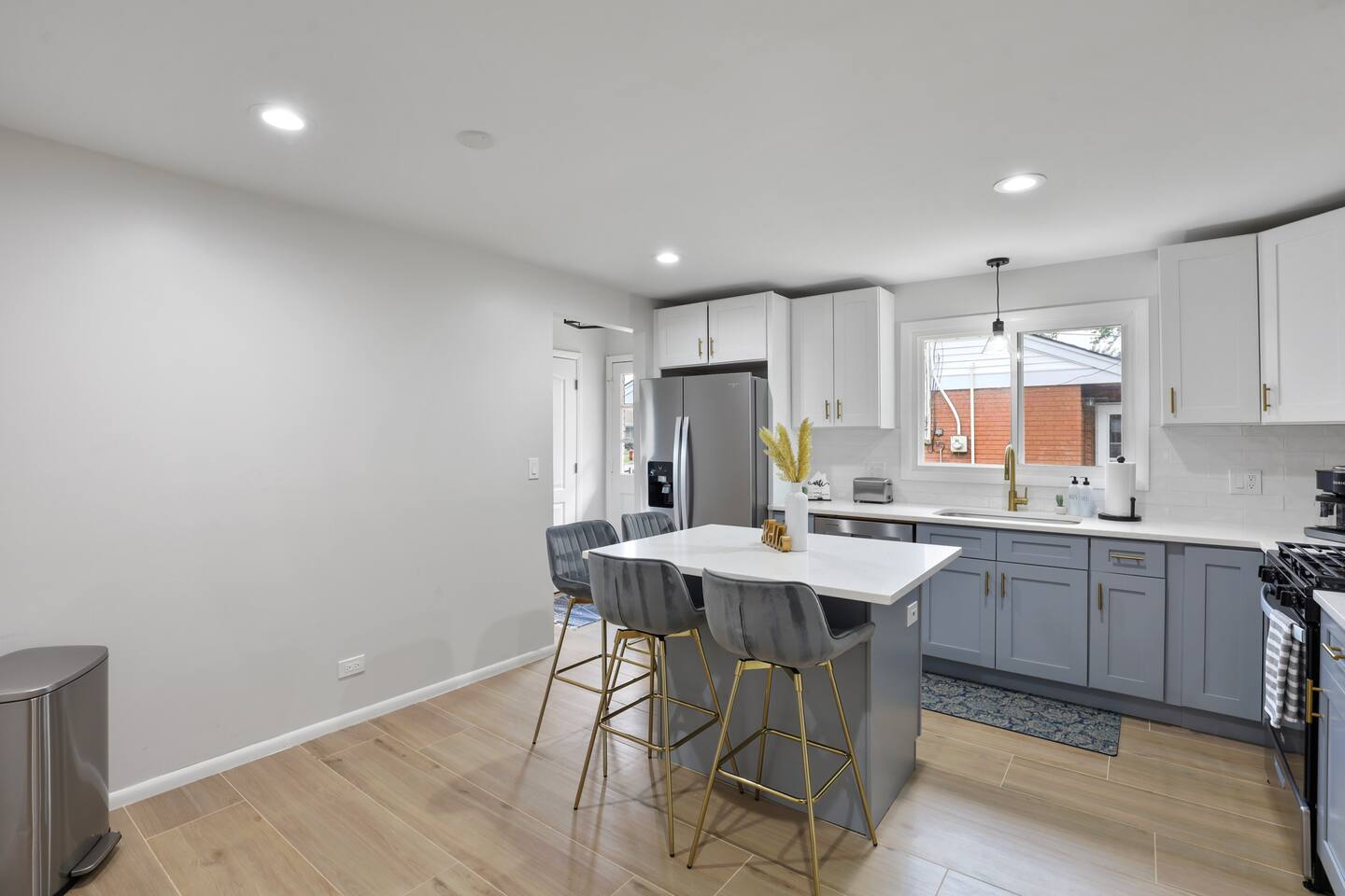 The welcoming open concept on the main floor features a livingroom and diningroom with a large dining table to host family and friends throughout your stay. As you walk the main floor, the natural light creates a warm and enlightening vibe. Don't worry about privacy! The windows are each equipped with blinds and curtains. The kitchen is fully furnished with a coffee bar, pots and a chic breakfast bar. The fridge has a water dispenser, perfect for riding your bike on the local trails of the Cook County Forest Preserves. The living room has a designated work area with a desk.