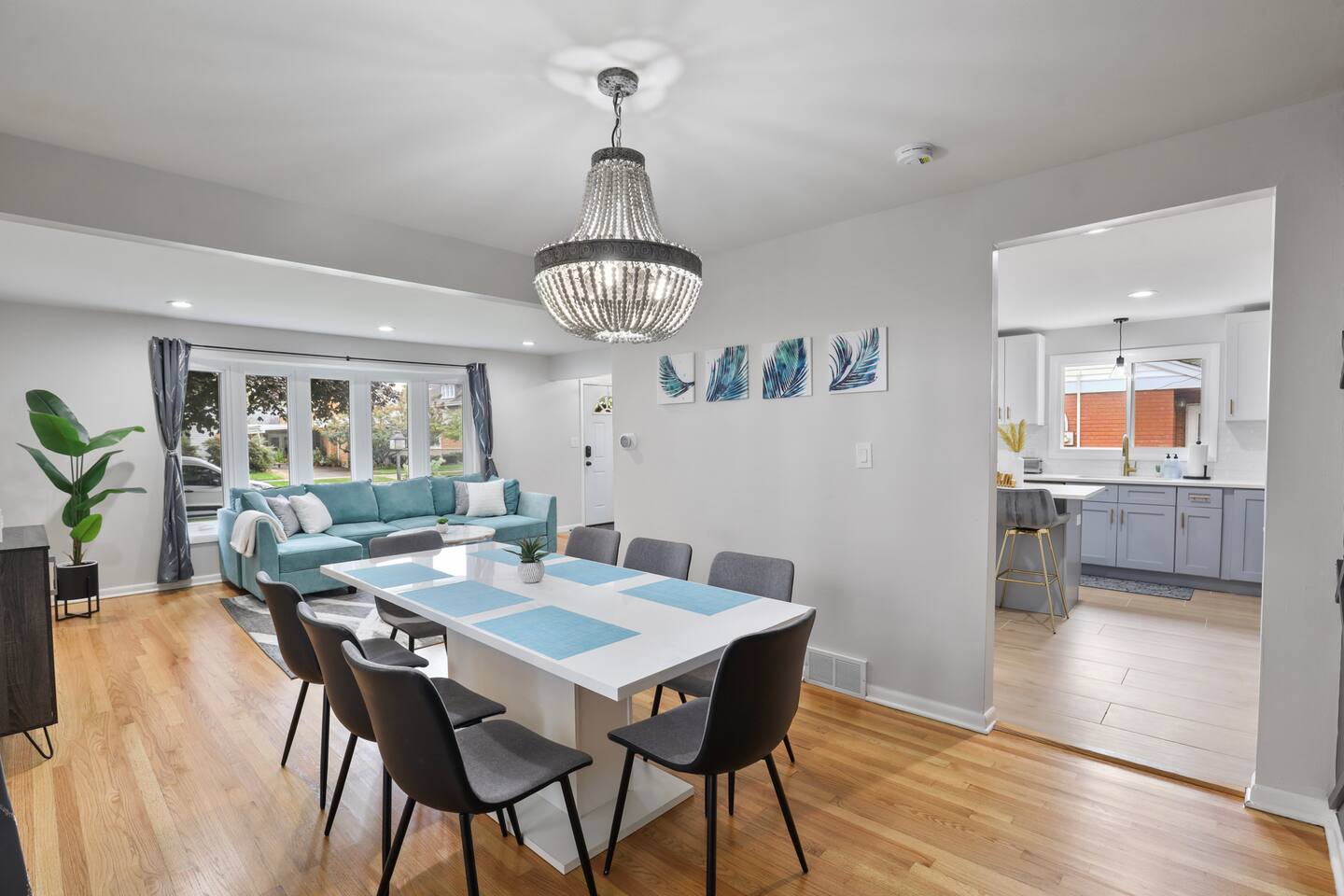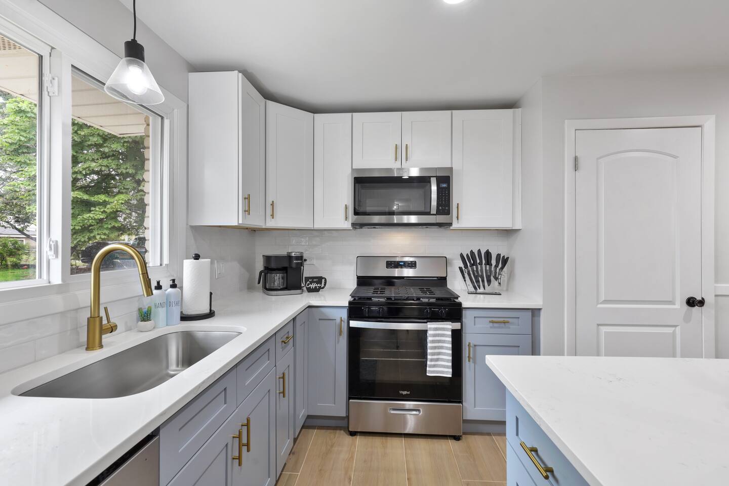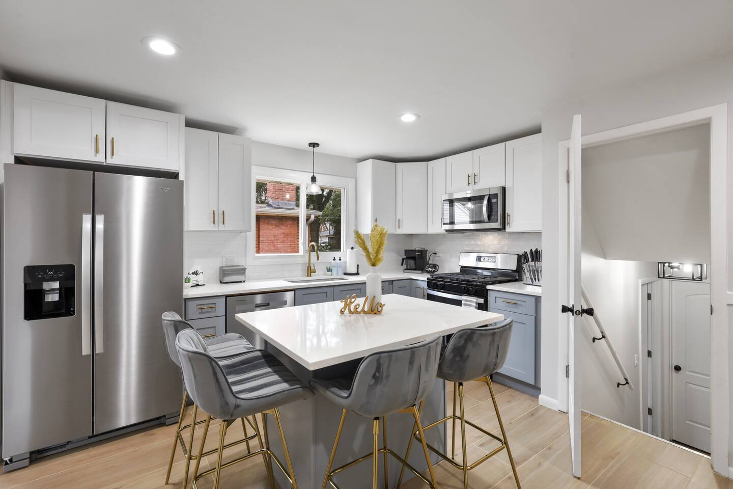 The welcoming open concept on the main floor features a livingroom and diningroom with a large dining table to host family and friends throughout your stay. As you walk the main floor, the natural light creates a warm and enlightening vibe. Don't worry about privacy! The windows are each equipped with blinds and curtains. The kitchen is fully furnished with a coffee bar, pots and a chic breakfast bar. The fridge has a water dispenser, perfect for riding your bike on the local trails of the Cook County Forest Preserves. The living room has a designated work area with a desk.
