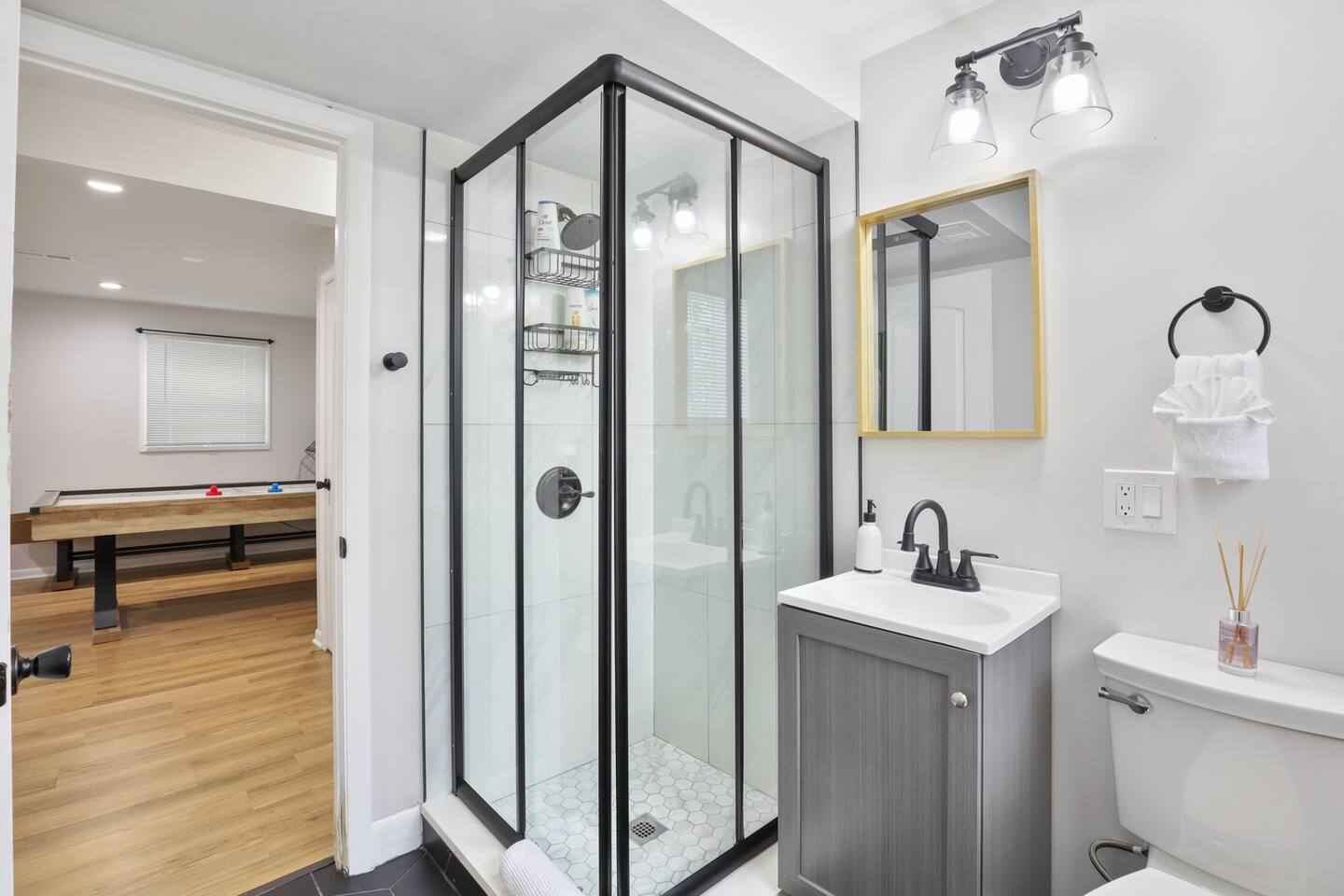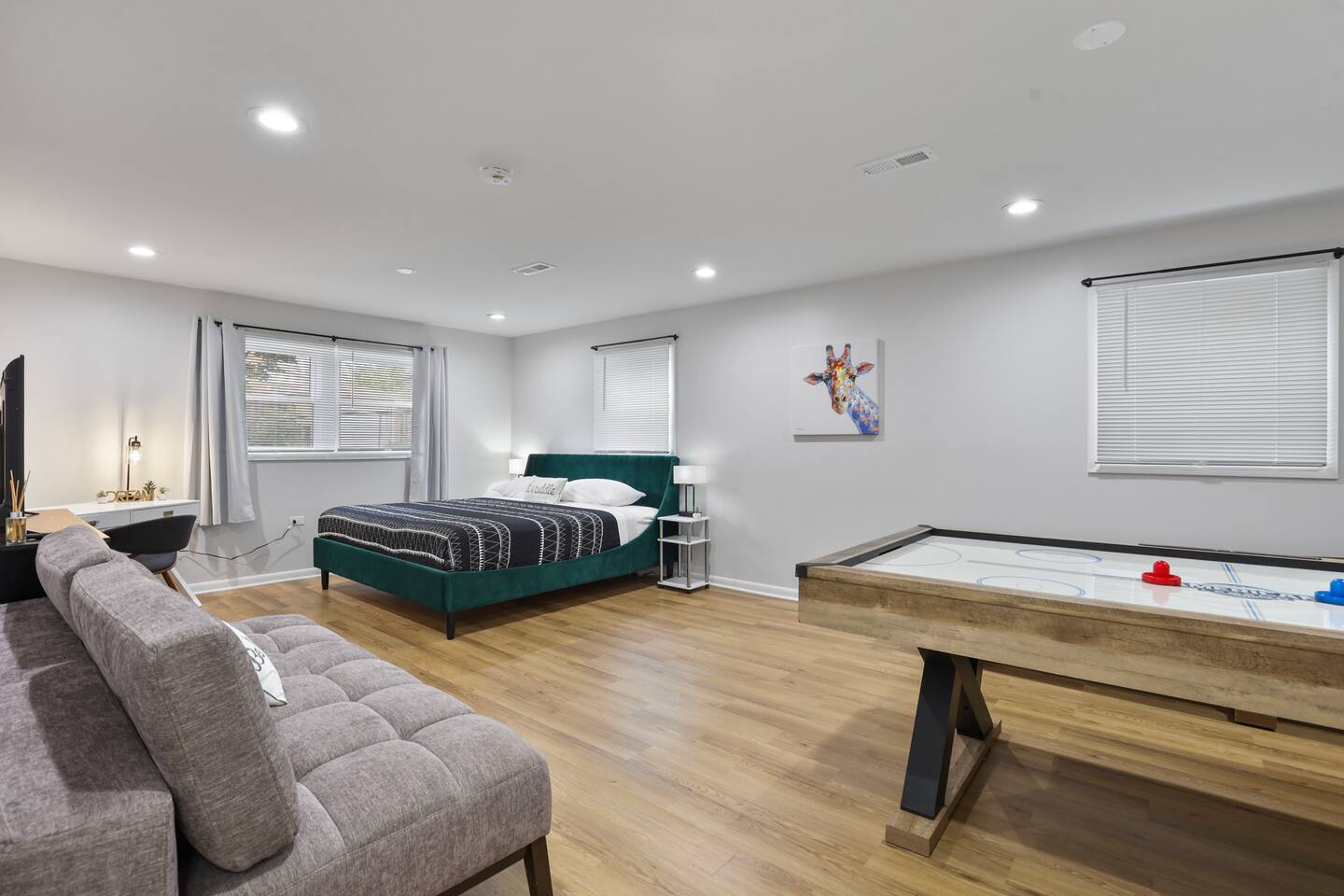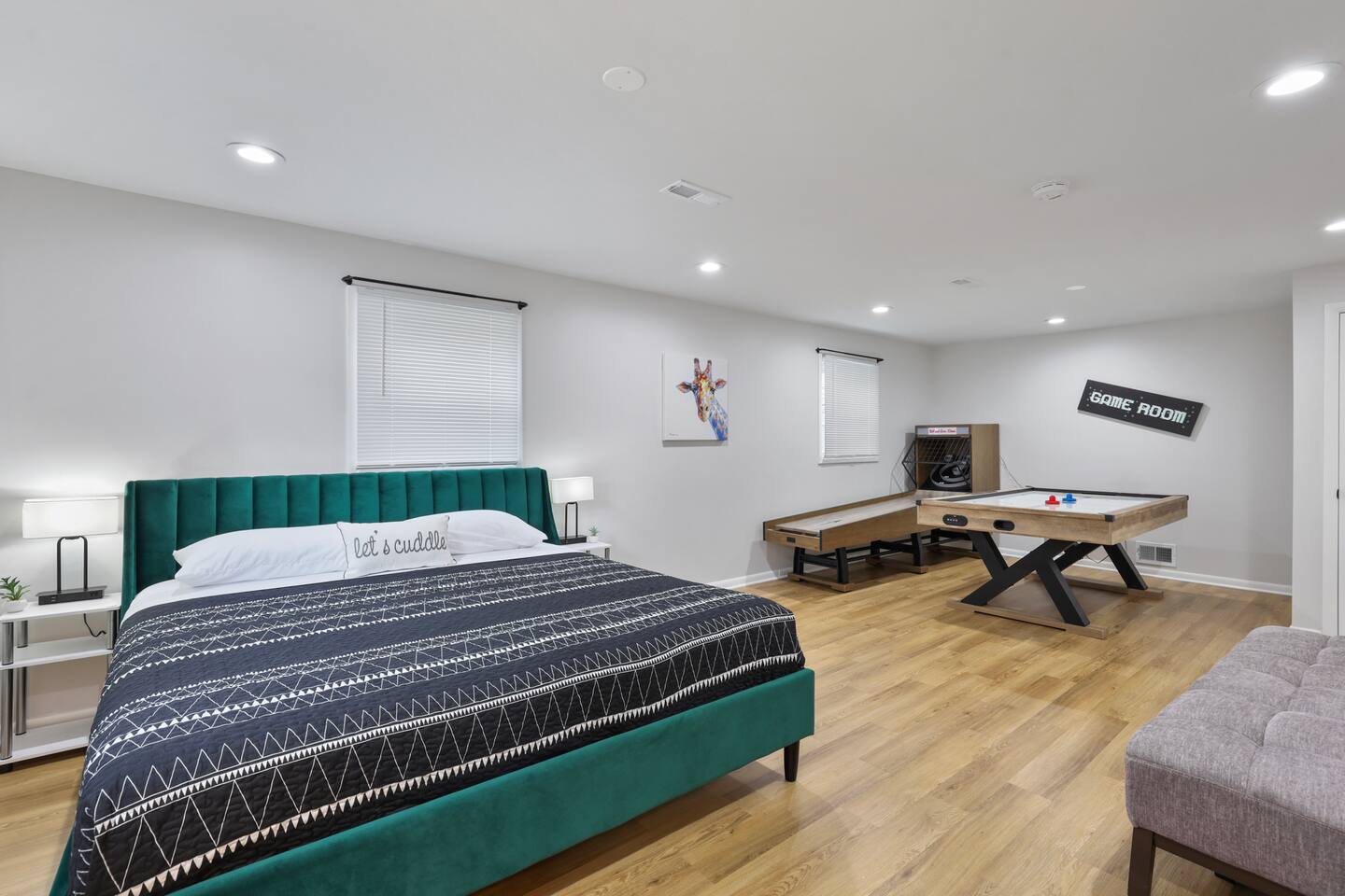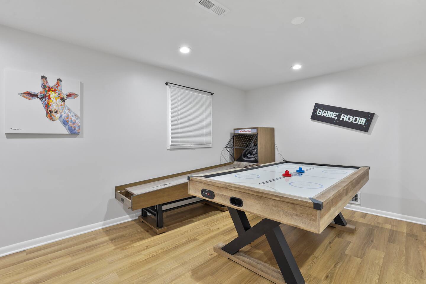 The lower level includes a king size bed and sofa bed. This area of the home has an air hockey table and skee ball machine- perfect arcade room! You could easily convert this into its own suite; there’s a door for extra privacy.